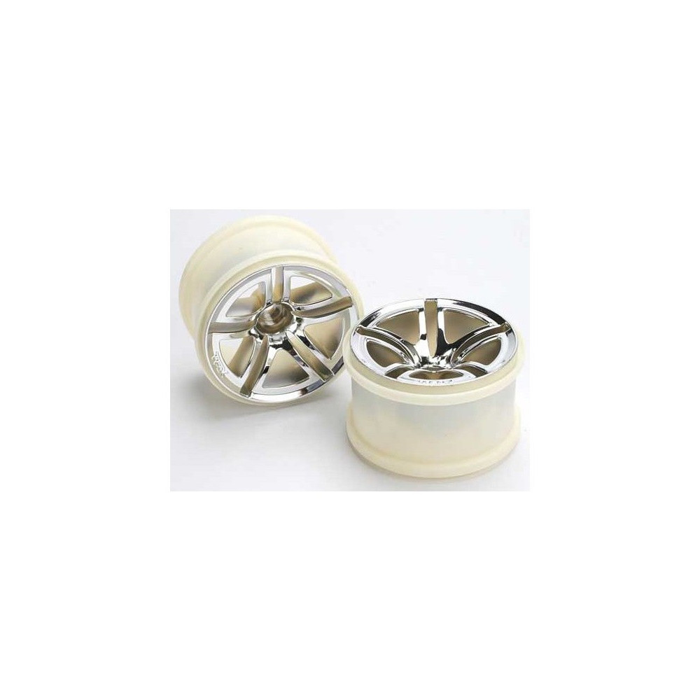 Kerekek nitro hátul, elecro elöl Twin Spoke krómozott fényes. A tárcsa átmérője 71mm (2.8"), szélessége 48mm. Traxxas Rustler, Stampede, Sport SE, Jato, Monster Jam modellekhez. Hatszög 12mm.