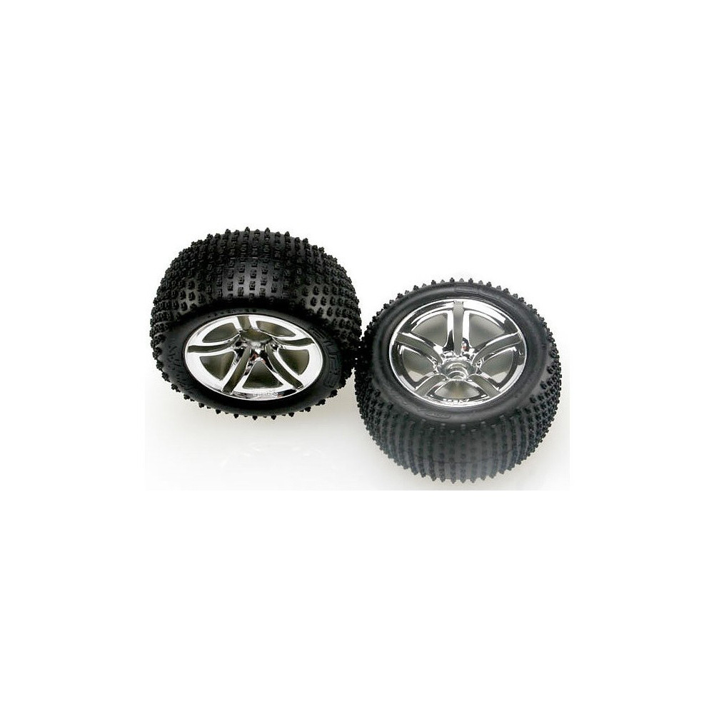 Komplett kerekek RC autókhoz. Krómozott dupla küllős kerekek Alias gumiabroncsokkal és betéttel. Tárcsa mérete 73x48 mm. Teljes méret 110x53 mm. Csapágyazás 12 mm-es hatszögletű, 18 mm-es eltolással.