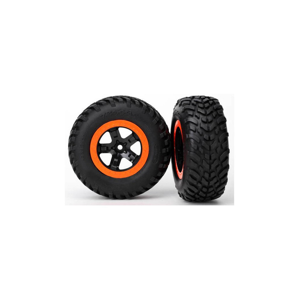 Komplett első kerekek Traxxas 2WD RC autókhoz. Fekete SCT kerekek narancssárga felnikkel, SCT abroncsokkal. Tárcsaméret 61/81x42 mm. Teljes méret 110x46 mm. A hordozó 12 mm-es hatszögletű, 22 mm-es eltolással.
