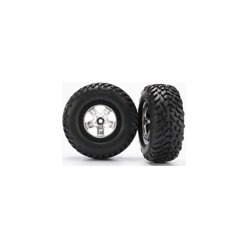 Komplett első kerekek a Traxxas Slash 2WD autókhoz. Ezüstszínű kerekek fekete felnikkel és felragasztott Off-Road abroncsokkal, betéttel. Tárcsa mérete 61/81x42 mm.