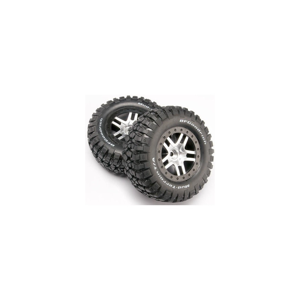 Komplett első kerekek a Traxxas Slash 2WD autókhoz. Fekete kerekek BFGoodrich® KM2 gumiabroncsokkal és betéttel.