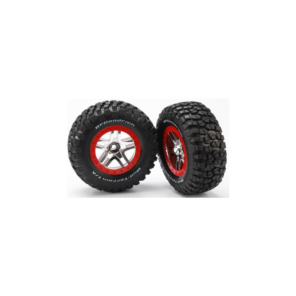 Komplett első kerekek a Traxxas Slash 2WD autókhoz. Ezüstszínű kerekek piros felnikkel és felragasztott BFGoodrich® KM2 gumiabroncsokkal és betéttel.