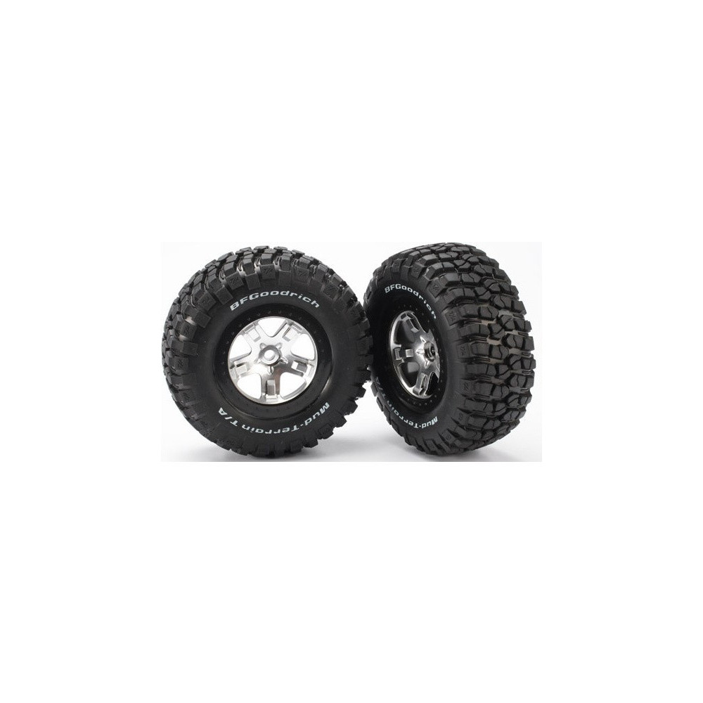 Komplett hátsó kerekek 2WD, első és hátsó kerekek 4WD Traxxas Slash-hez. Ezüstszínű kerekek fekete felnikkel, BFGoodrich® KM2 gumiabroncsokkal és betéttel.