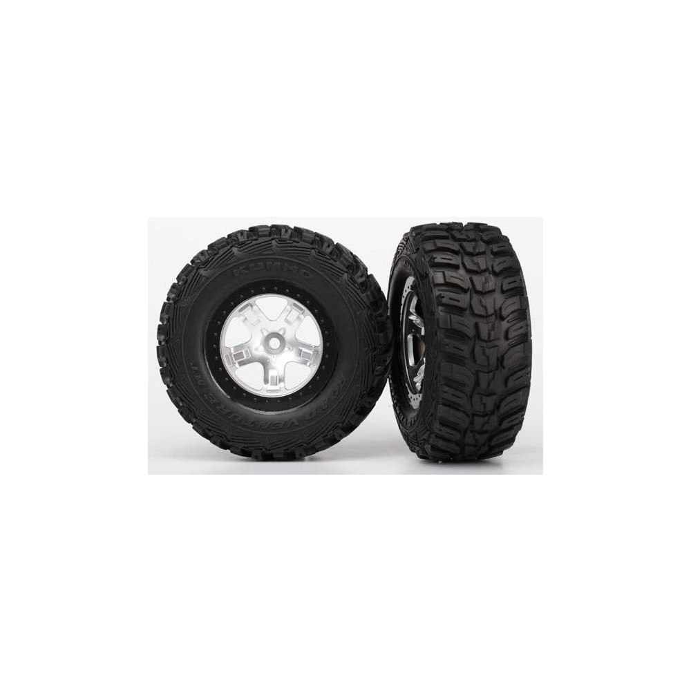Teljes hátsó kerekek 2WD, első és hátsó kerekek 4WD Traxxas Slash-hez. Ezüst keréktárcsák fekete felnikkel és Kumho gumiabroncsokkal (lágy keverék) és betéttel.