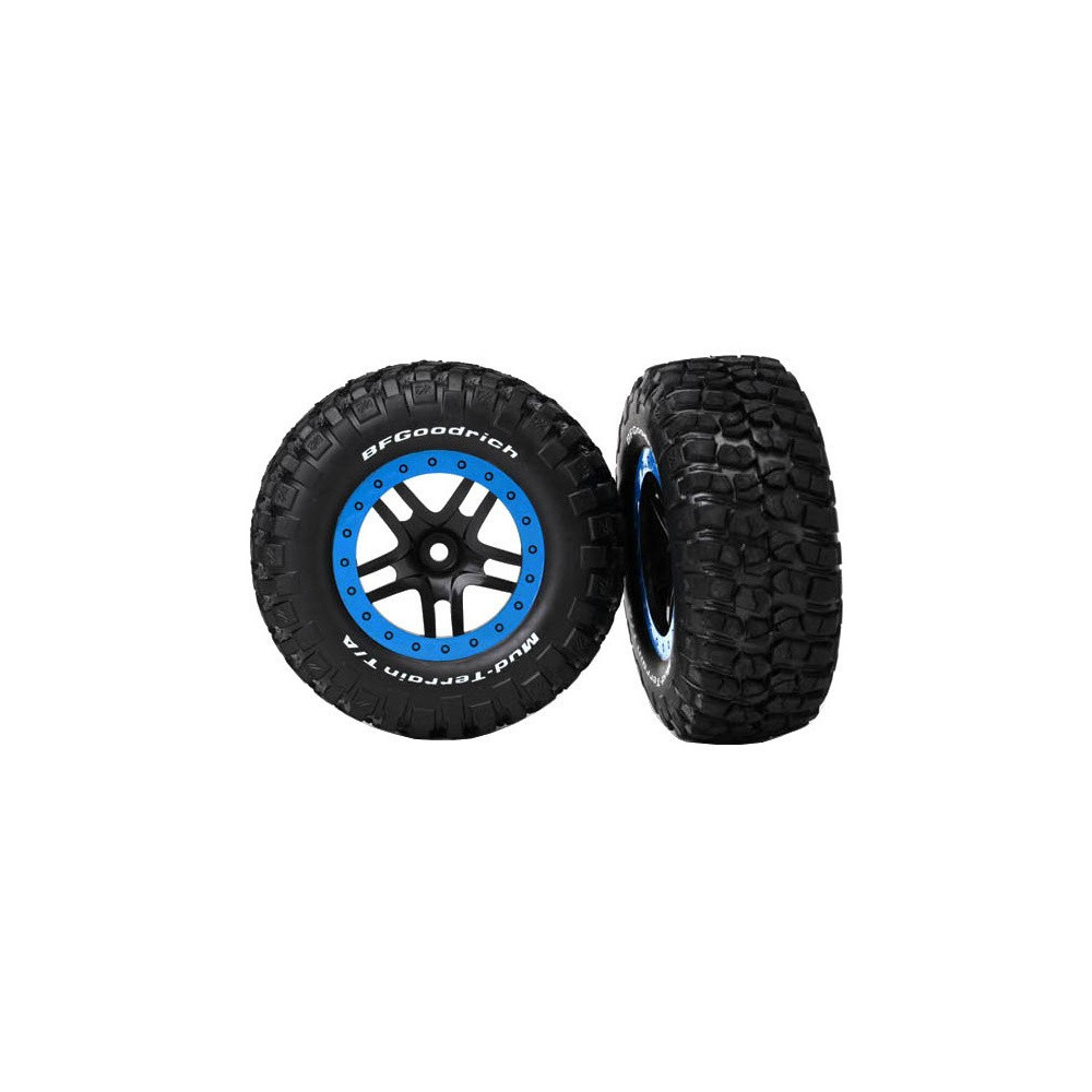Komplett első kerekek Traxxas 2WD RC autókhoz. Split Spoke fekete kerekek kék felnikkel, Goodrich KM2 Mud Terrain gumiabroncsokkal. Tárcsa mérete 61/81x42 mm. Teljes méret 110x46 mm. A hordozó 12 mm-es hatszögletű, 22 mm-es eltolással.