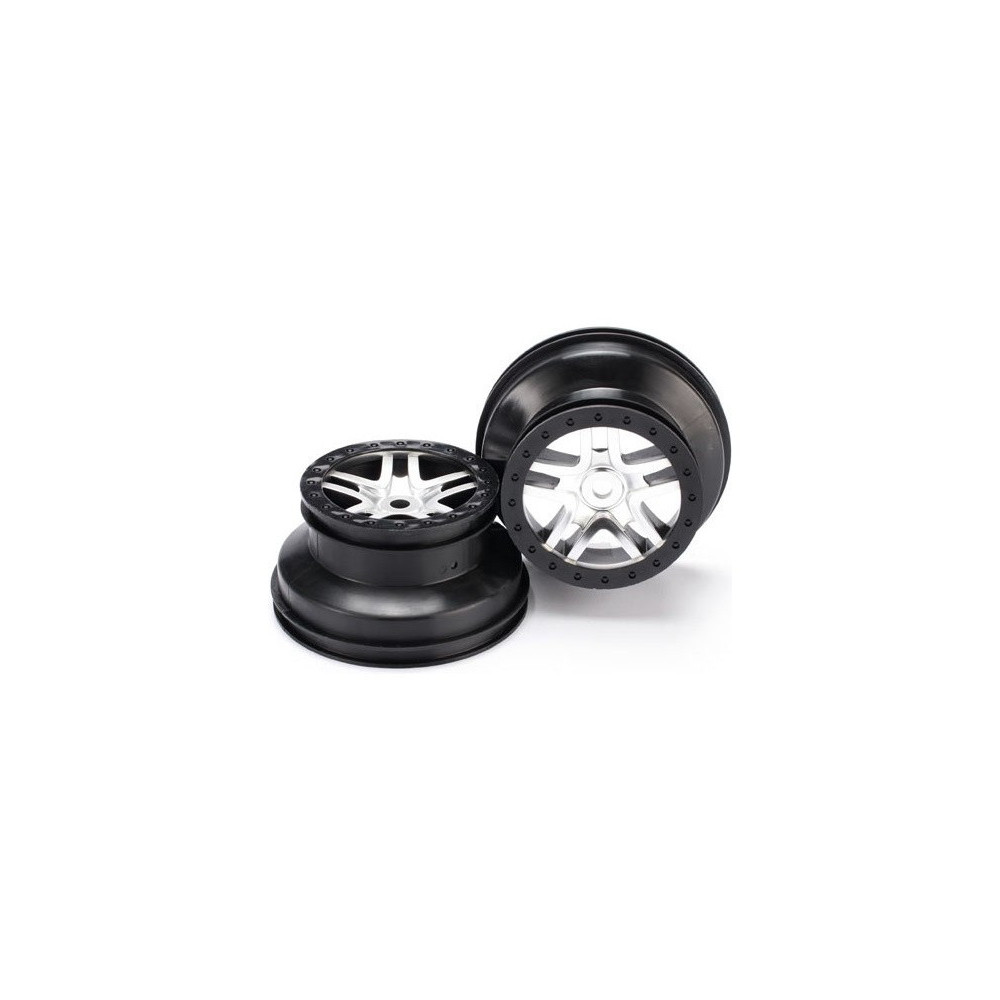 Univerzális SCT Split Spoke keréktárcsák matt krómozott, fekete felnivel. Tárcsaátmérő 56/76mm (2.2/3.0"), szélesség 41mm. Traxxas Slayer 3.3 autókhoz.