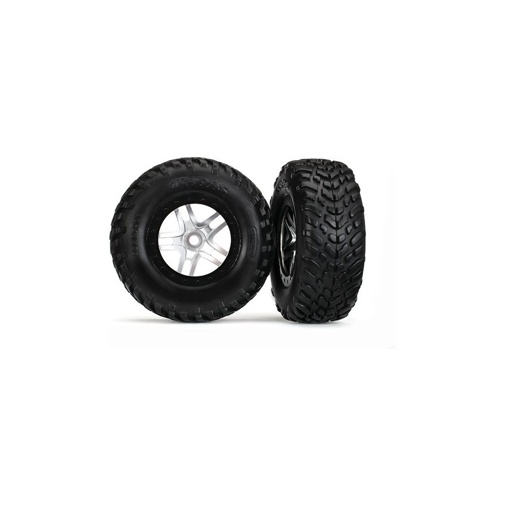 Teljes univerzális kerekek a Traxxas Slayer autókhoz. Ezüstszínű SCT Split-Spoke kerekek fekete felnikkel és SCT abroncsokkal (S1 szuper lágy keverék).