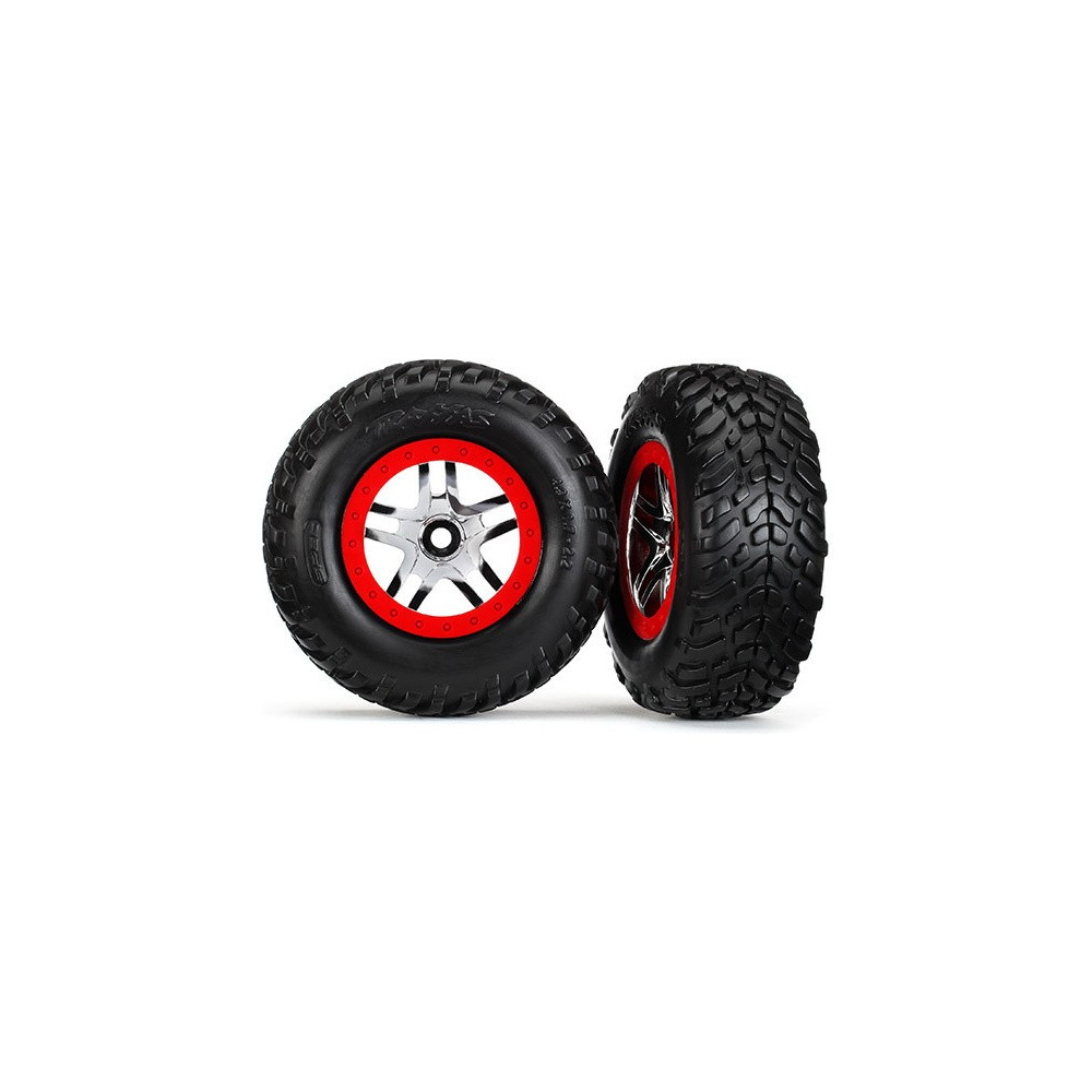 Teljes univerzális kerekek a Traxxas Slayer autókhoz. SCT Split-Spoke krómozott kerekek piros felnikkel és SCT gumiabroncsokkal. Tárcsaméret 61/81x42 mm. Teljes méret 110x46 mm. A hordozó 12 mm-es hatszögletű, 30 mm-es eltolással.