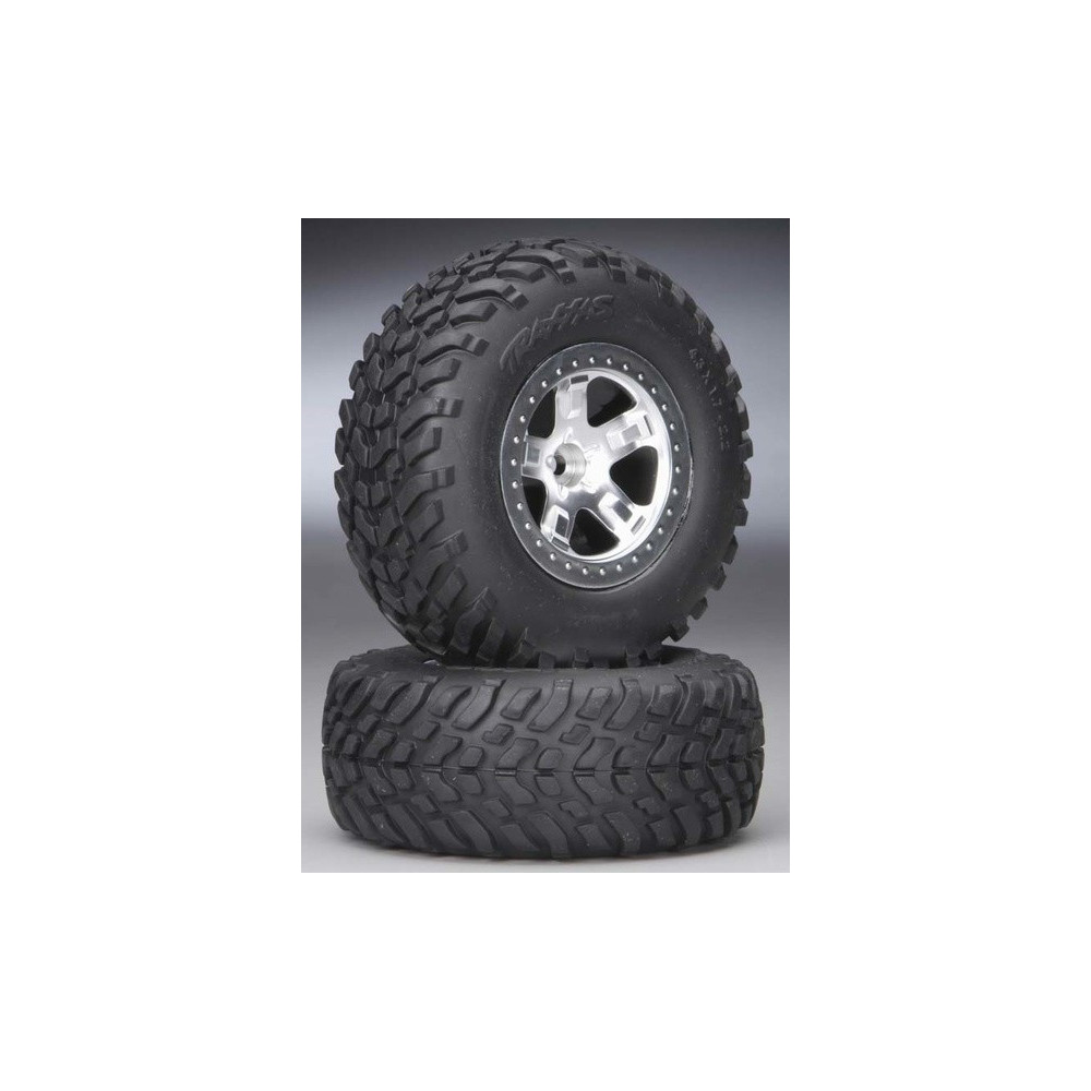 Komplett hátsó kerekek 2WD, első és hátsó kerekek 4WD RC autókhoz Traxxas. Ezüst osztott küllős tárcsa BFGoodrich KM2 Mud Terrain gumiabroncsokkal és betéttel.