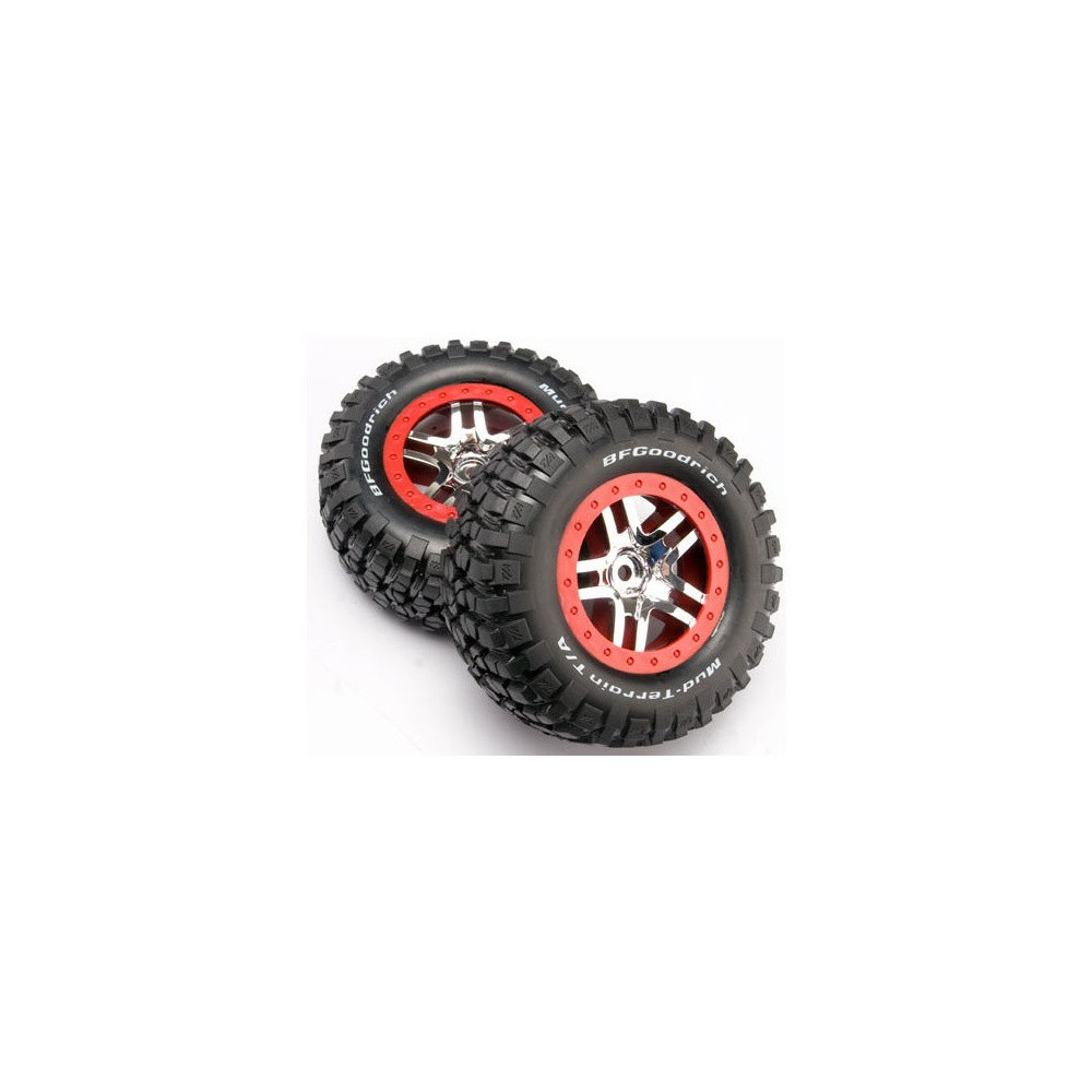 Komplett hátsó kerekek 2WD, első és hátsó kerekek 4WD RC autókhoz Traxxas. Ezüstszínű osztott küllős tárcsa, piros felnikkel, BFGoodrich KM2 Mud Terrain gumiabroncsokkal és betéttel. Tárcsa mérete 61/81x42 mm. Teljes méret 110x46 mm. A hordozó 12 mm-es hatszögletű, 24 mm-es eltolással.