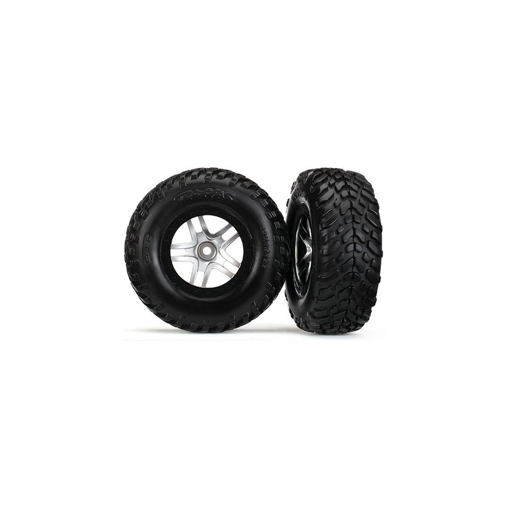 Komplett hátsó kerekek 2WD, első és hátsó kerekek 4WD RC autóhoz Traxxas Slash. Ezüstszínű, osztott küllős kerekek fekete felnikkel, SCT abroncsokkal.