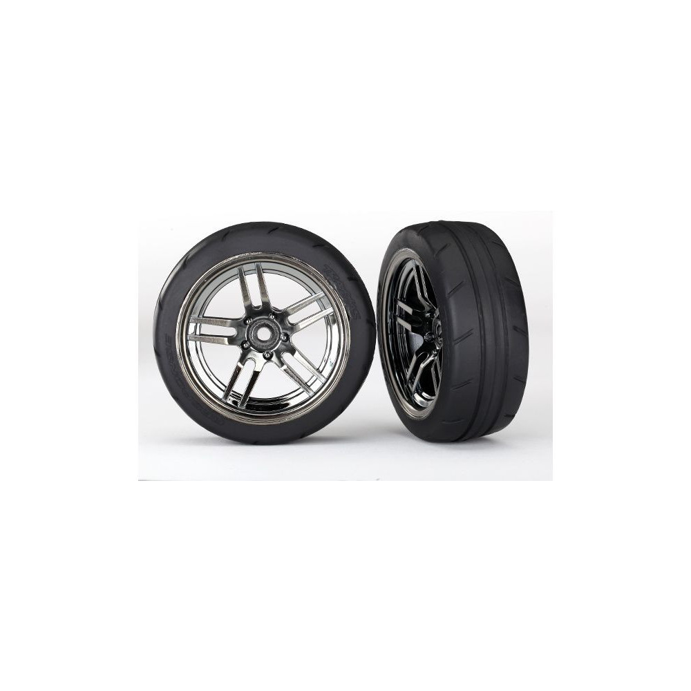 Komplett első kerekek a Traxxas 4-Tec 2.0 RC autó modellekhez. Osztott küllős fekete krómozott kerekek Response gumiabroncsokkal (2 db a csomagban).