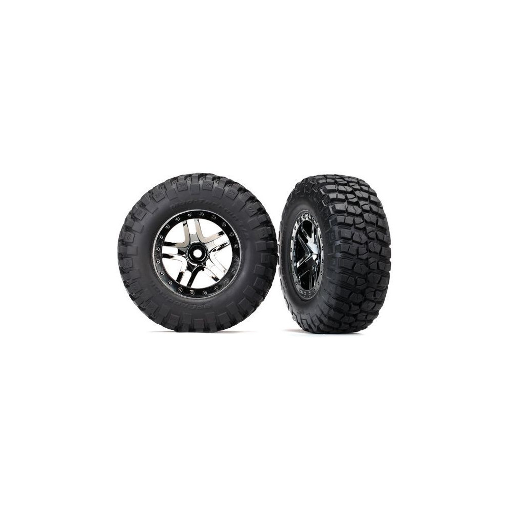 Komplett hátsó kerekek 2WD, első és hátsó kerekek 4WD RC autókhoz Traxxas. Ezüst split-spoke tárcsa BFGoodrich KM2 Mud Terrain (S1 szuper lágy keverék) abroncsokkal és betéttel.
