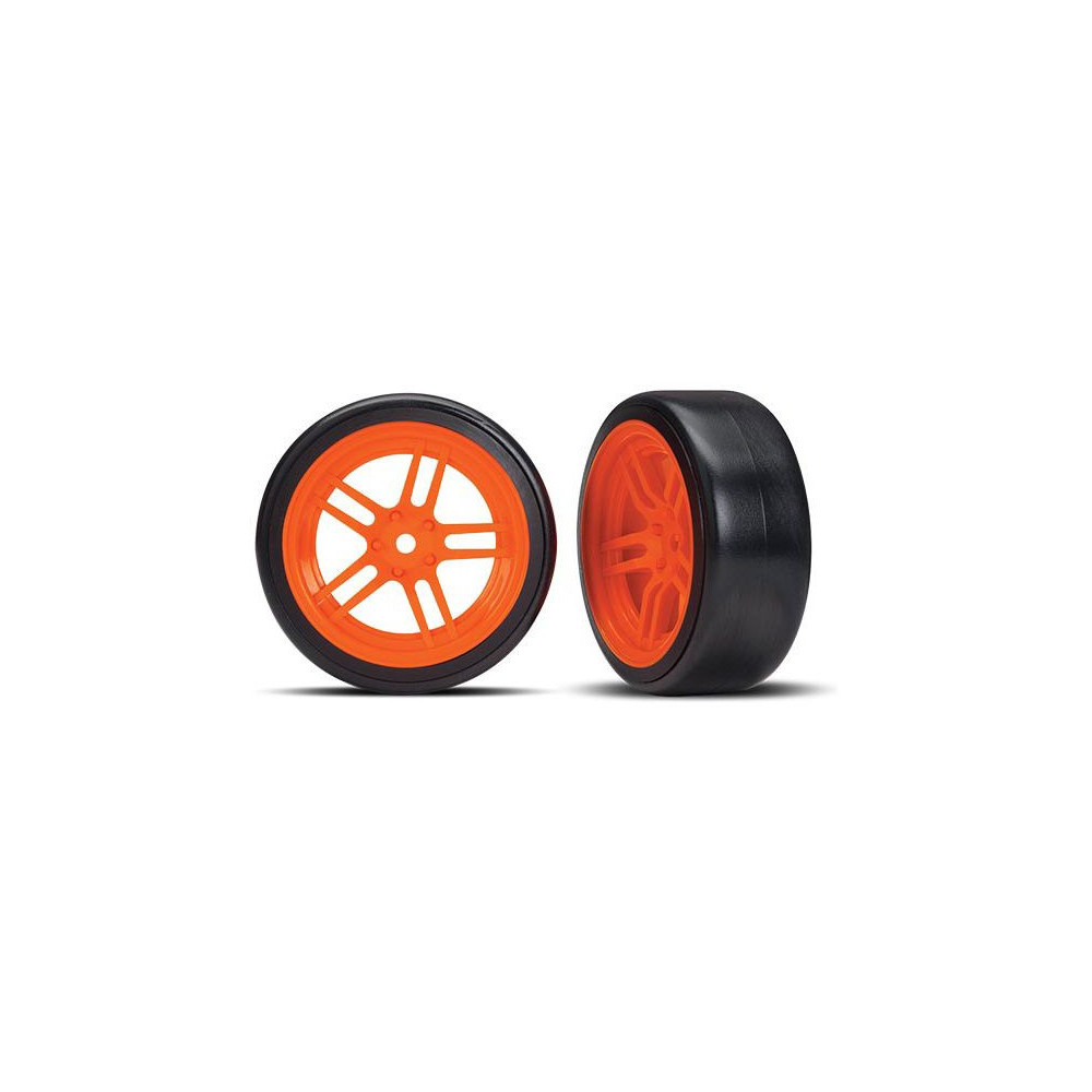 Komplett első kerekek a Traxxas 4-Tec 2.0 RC autó modellekhez. Narancssárga osztott küllős kerekek Drift abroncsokkal (2 db a csomagban).