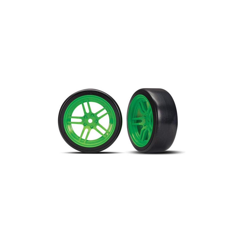 Komplett első kerekek a Traxxas 4-Tec 2.0 RC autó modellekhez. Zöld osztott küllős kerekek Drift abroncsokkal (2 db a csomagban).