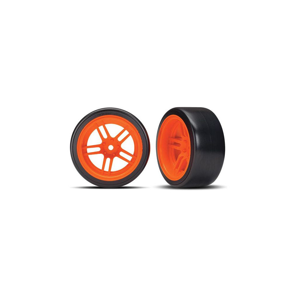 Komplett hátsó kerekek a Traxxas 4-Tec 2.0 RC autó modellekhez. Narancssárga osztott küllős kerekek Drift abroncsokkal (2 db a csomagban).