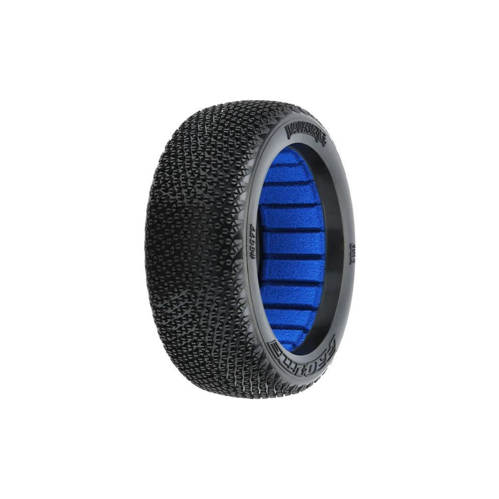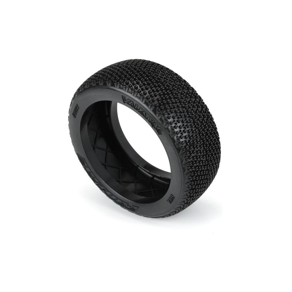 Az innovatív futófelületi mintázat stratégiailag elhelyezett, átlósan elhelyezkedő sarkantyúsorokat tartalmaz, amelyek találkozásukkal egy optimalizált középső sapkát hoznak létre. Ez az elrendezés jelentősen könnyítette a gumiabroncsot, miközben kiváló stabilitást és gyorsulási, kopási jellemzőket biztosít egyenetlen terepen való vezetéskor. Az oldalfal szélén található irányított futófelület lehetővé teszi, hogy a Valkyrie-t az adott pálya körülményeihez hangolja, így nagyobb sokoldalúságot biztosít. A Valkyrie a legújabb generációs Pro-Line vázprofilra épül, amely egyetlen ívvel alakítja ki az oldalfal geometriáját, majd az oldalfalról a korona felé nagyobb sugárral megy át, ami kerekebb és kevésbé éles formát eredményez. Ez a váz a tárcsához és a betéthez igazodik, így a felszerelés gyerekjáték.
