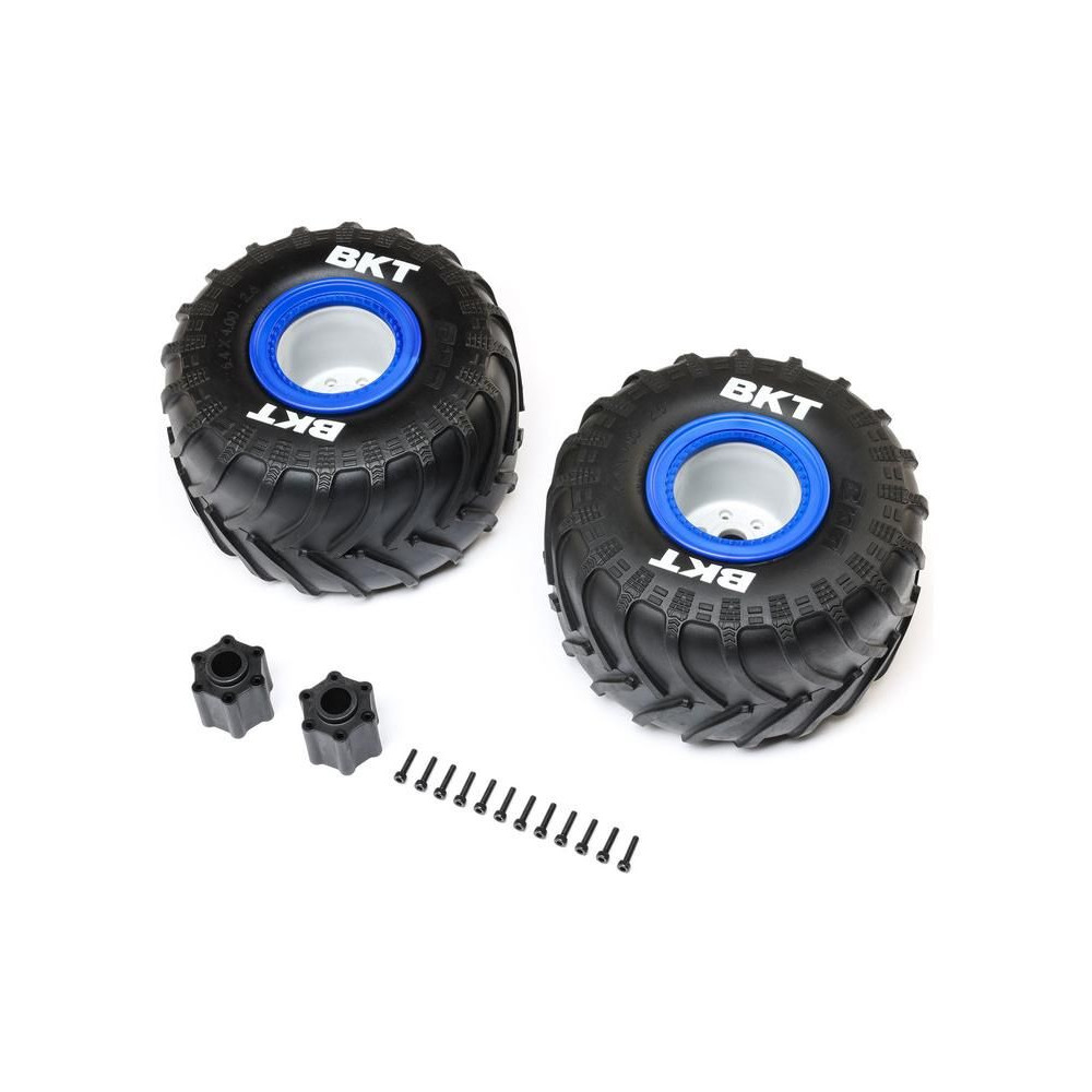 Losi LMT 2.0 RC modellautó alkatrész: 2,6"-os kerék BKT Monster Truck gumikkal, közepes betéttel, kék színű beadlock-kal (2).