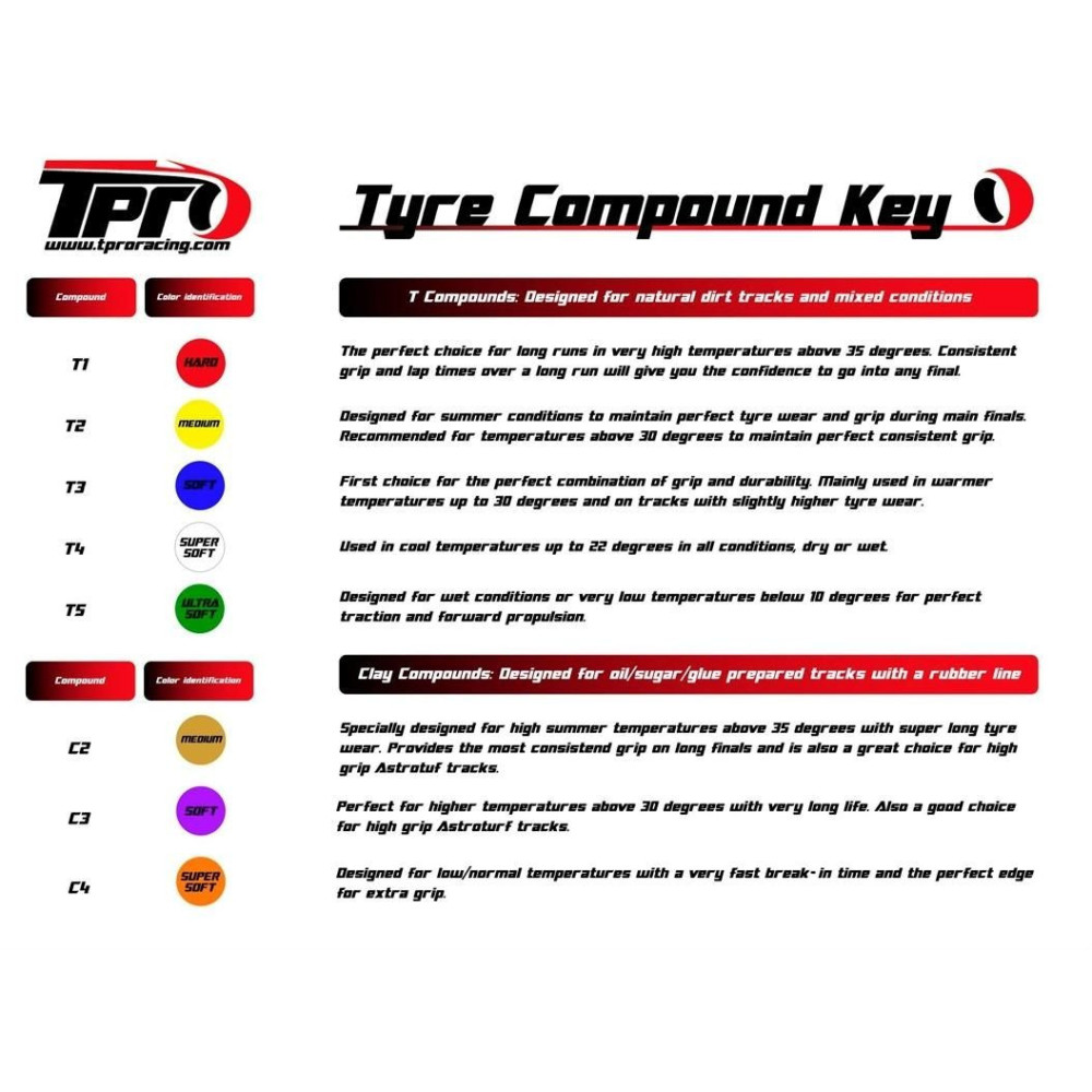 A ZR keveréket T2-Közepes, T3-Lágy és T4-Szuperlágy keménységben kínáljuk. Megfelelő adalékanyagok segítségével a ZR keverék agyag változatban is kapható C3-Lágy és C4-Szuperlágy keménységben. Végül pedig, rendkívül párás és nedves körülményekre a Wet változatot kínáljuk W5-Ultra Soft kivitelben. Így több mint 60 különböző TPRO gumiabroncs közül választhat. Biztosan minden felhasználási célra megtalálja az ideális gumiabroncsot.