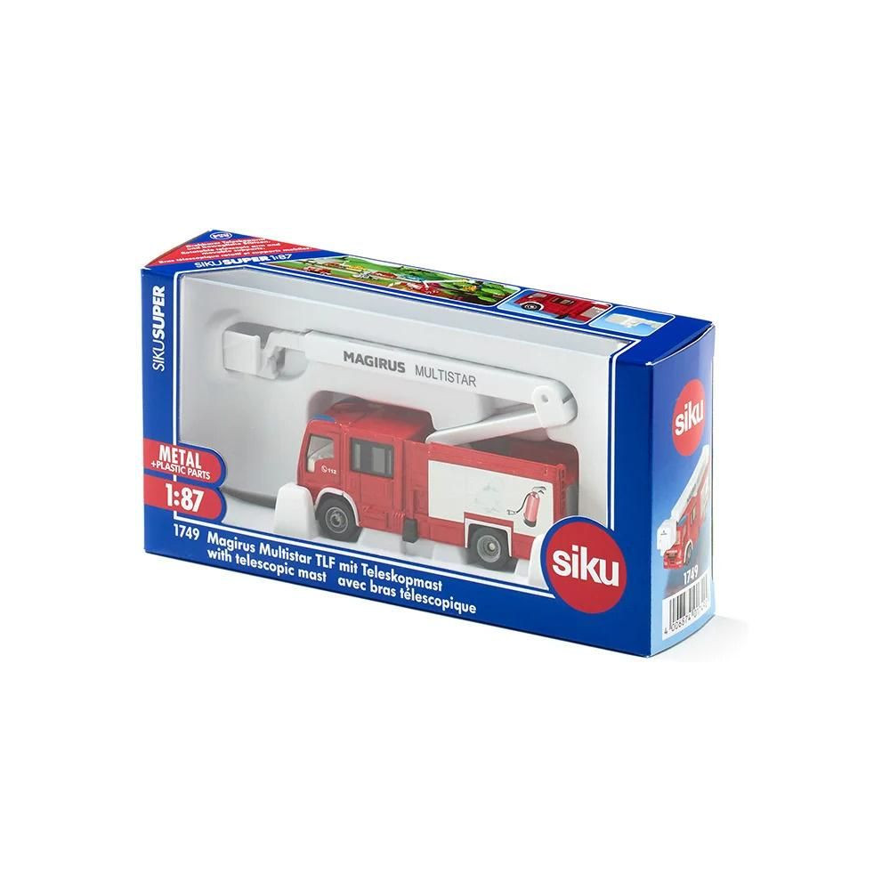 1:87 méretarányú fém modell a Magirus Multistar tűzoltóautó platformmal a Siku-tól. A modell összecsukható teleszkópos platóval rendelkezik mentőkosárral, kihúzható támasztékkal és gumiabroncsokkal. Játékra és gyűjtésre egyaránt alkalmas. Kiváló minőségű fém és műanyag kivitelezés.