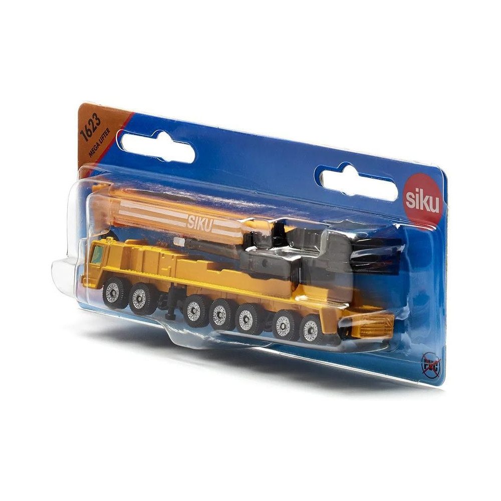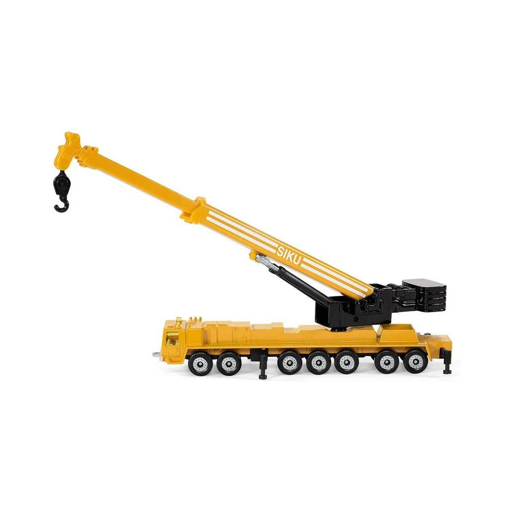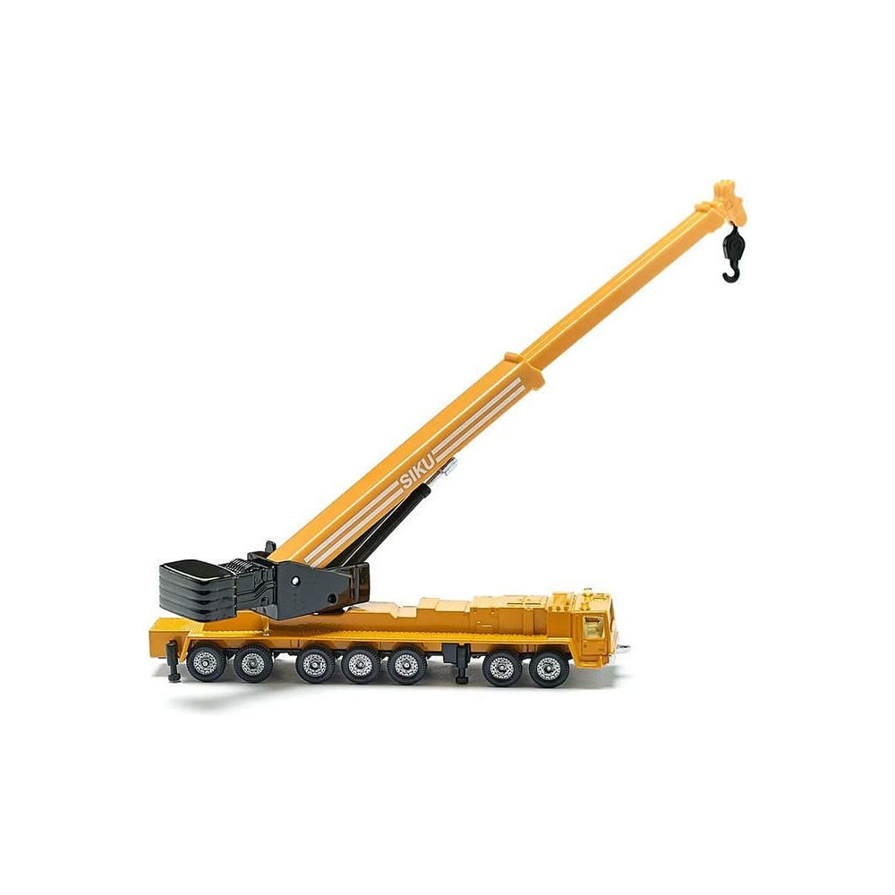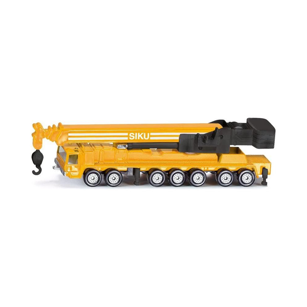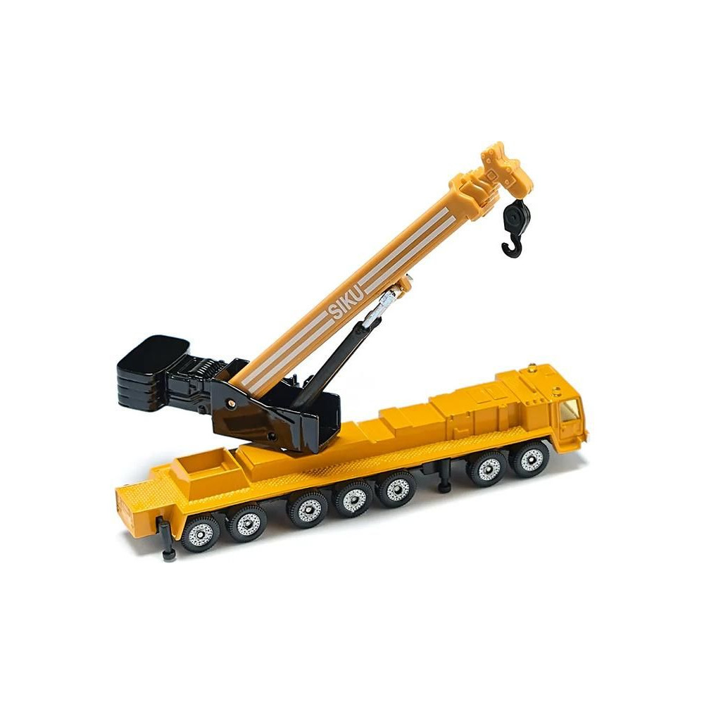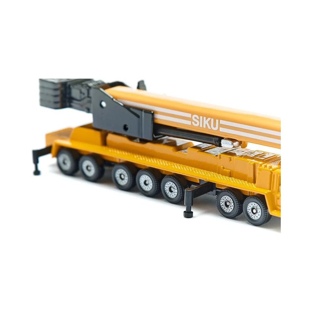 Siku márkájú nehézgépjármű-daru fémmodellje, hossza kb. 15 cm. A mobildaru átlátszó ablakokkal, kihúzható lábakkal és egy forgatható, részben kihúzható karral van felszerelve. Játékra és gyűjtögetésre alkalmas. Minőségi fém- és műanyag kidolgozás. Blisztermesztő dobozban csomagolva.