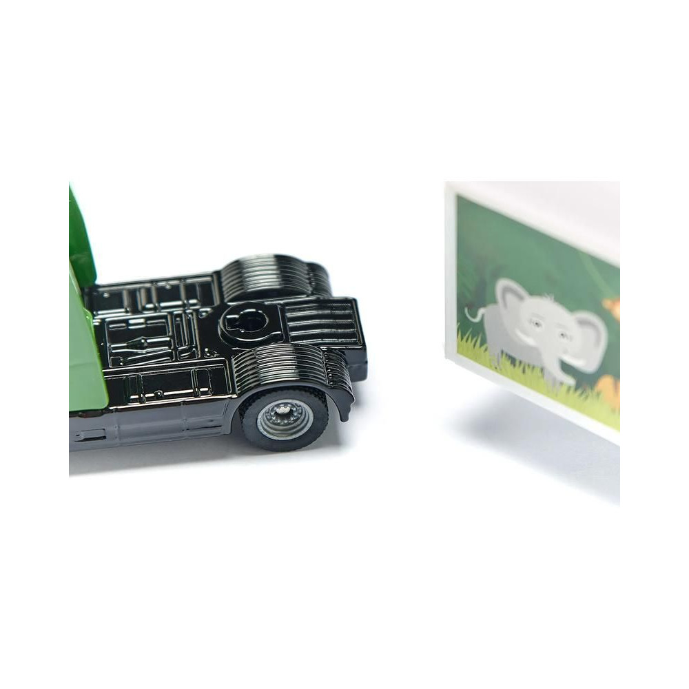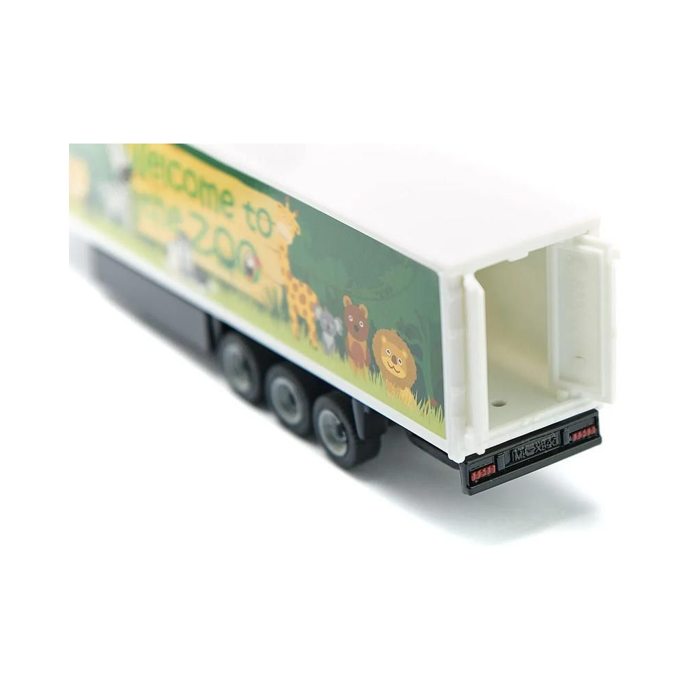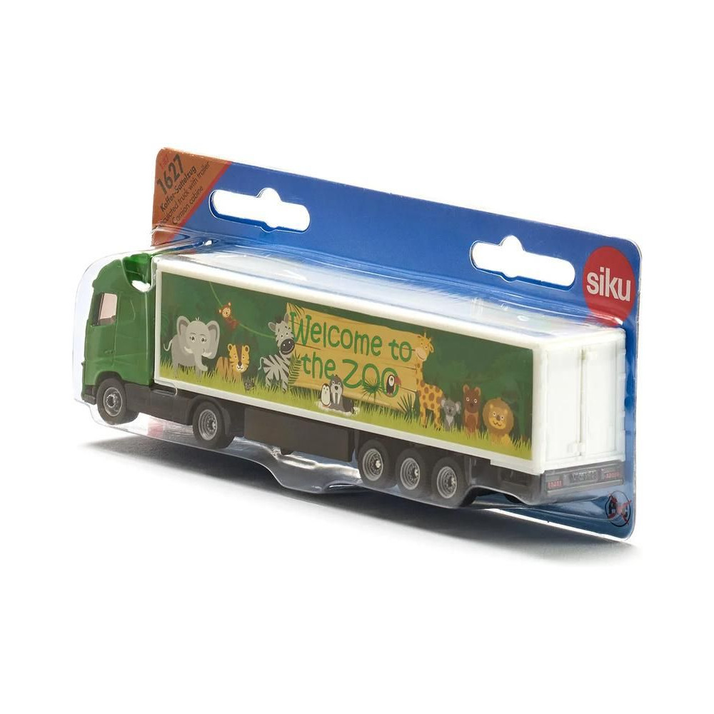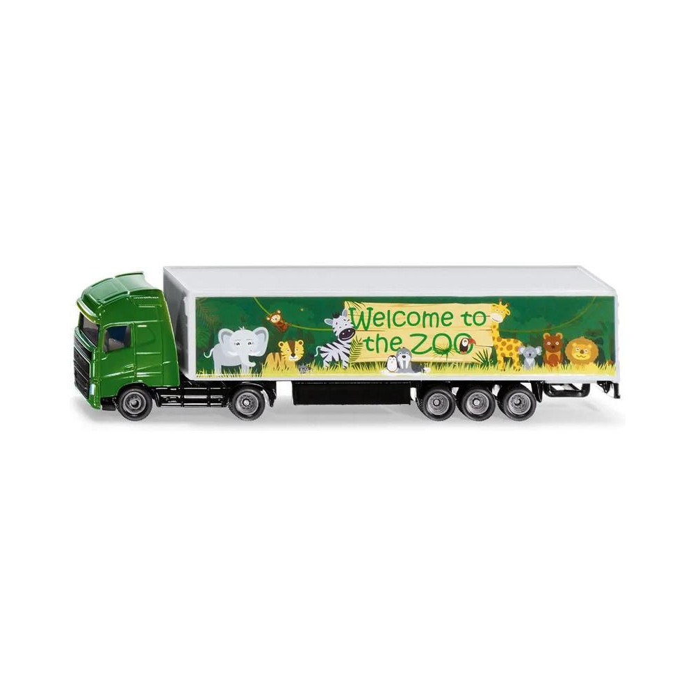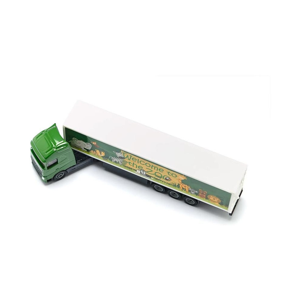 Siku márkájú Volvo nyerges vontató fémmodellje dobozos pótkocsival, hossza kb. 19 cm, méretarány 1:87. A vontató gumiabroncsokkal és átlátszó ablakokkal van felszerelve. A félpótkocsi levehető, a hátsó ajtó nyitható és játékos, állatkerti motívumos grafikával díszített. Játékra és gyűjtögetésre alkalmas. Minőségi fém és műanyag kidolgozás. Bliszterben csomagolva.