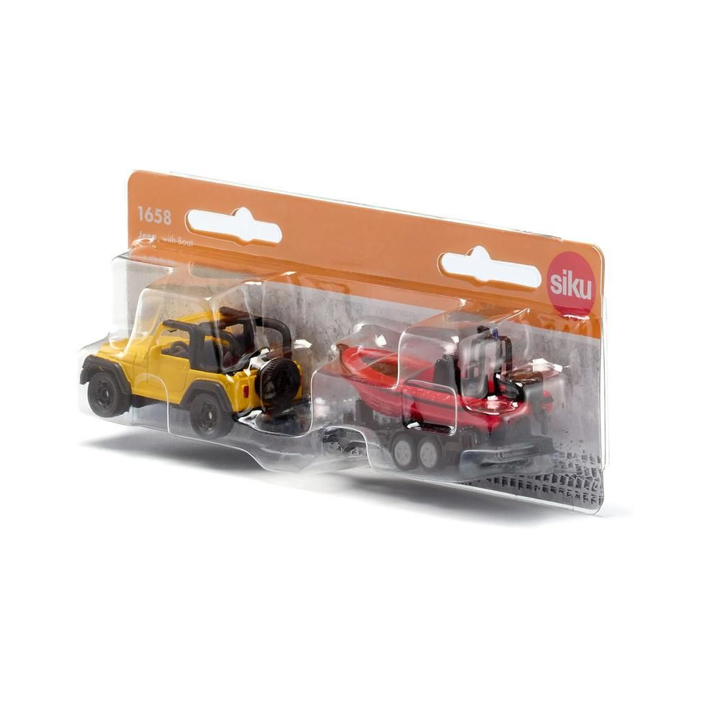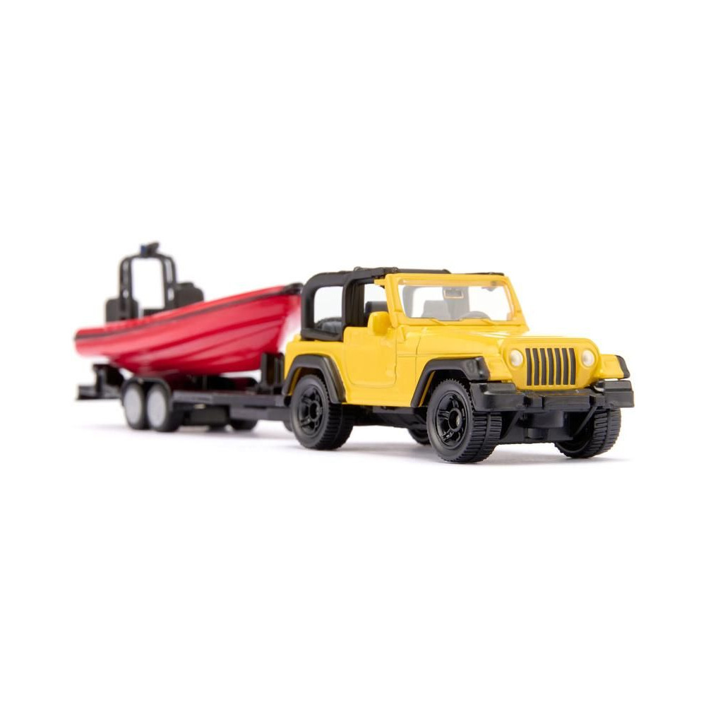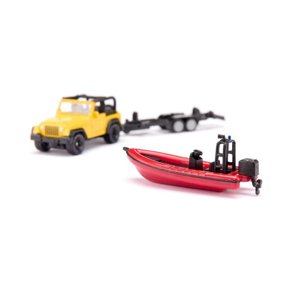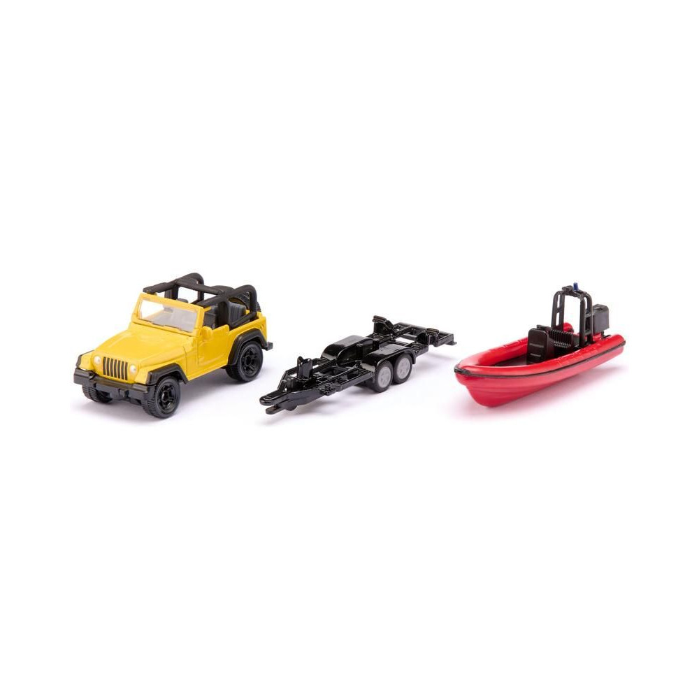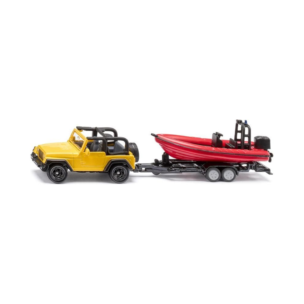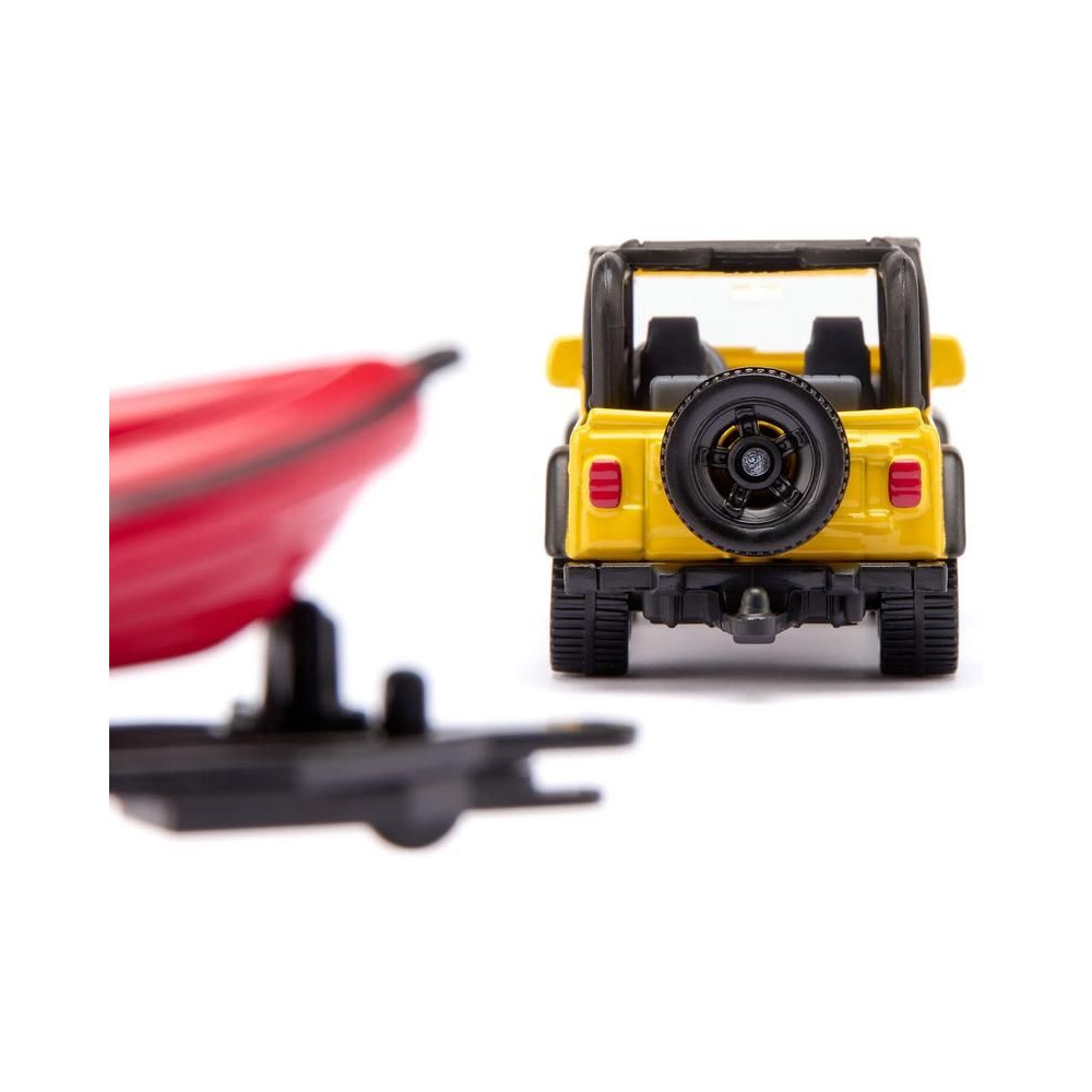Siku Jeep Wrangler terepjáró fém modellje utánfutóval és hajóval, hossza kb. 17 cm, méretarány 1:87. A modell kidolgozott belső térrel rendelkezik, a kéttengelyes utánfutó levehető, a hajó úszik a vízen. Játékra és gyűjtögetésre alkalmas. Minőségi fém és műanyag kidolgozás. Bliszterben csomagolva.