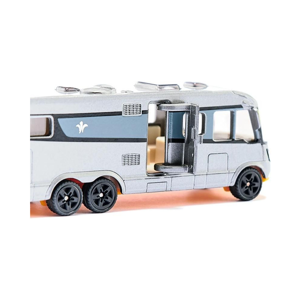 A Niesmann & Bischoff luxus lakóautó fém modellje, hossza kb. 13 cm. A háromtengelyes modell átlátszó ablakokkal és napfénytetővel, kifinomult belső térrel, nyitható oldalsó ajtókkal és vonóhoroggal rendelkezik. Játékra és gyűjtögetésre egyaránt alkalmas. Minőségi fém és műanyag kidolgozás. Bliszteres csomagolásban.