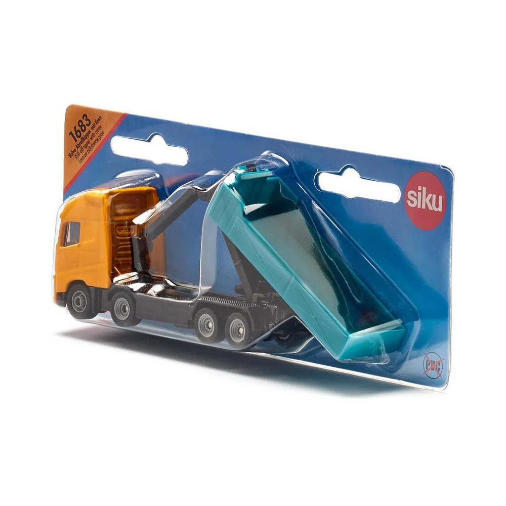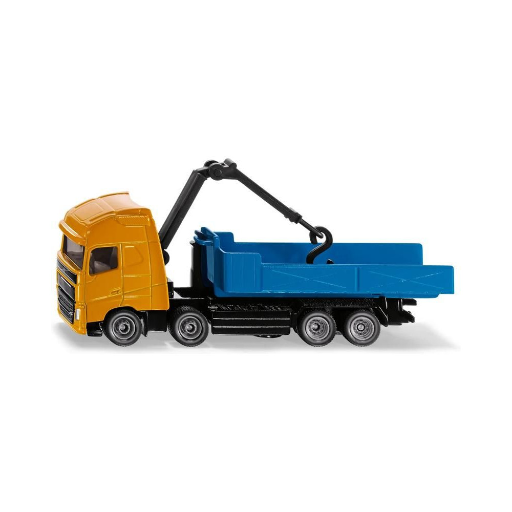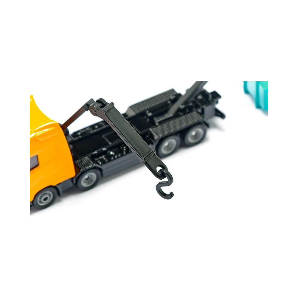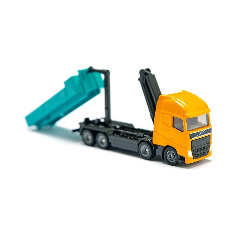 Volvo teherautó fémmodell horgos konténerrel és hidraulikus karral, hossza kb. 13 cm, méretarány 1:87. A horgos konténer lehajtható és a földre helyezhető. A daru karja két ízülettel rendelkezik, forgatható és emelőhoroggal van felszerelve. Játékra és gyűjtögetésre alkalmas. Minőségi fém- és műanyag kidolgozás. Blisztermesztő dobozban csomagolva.