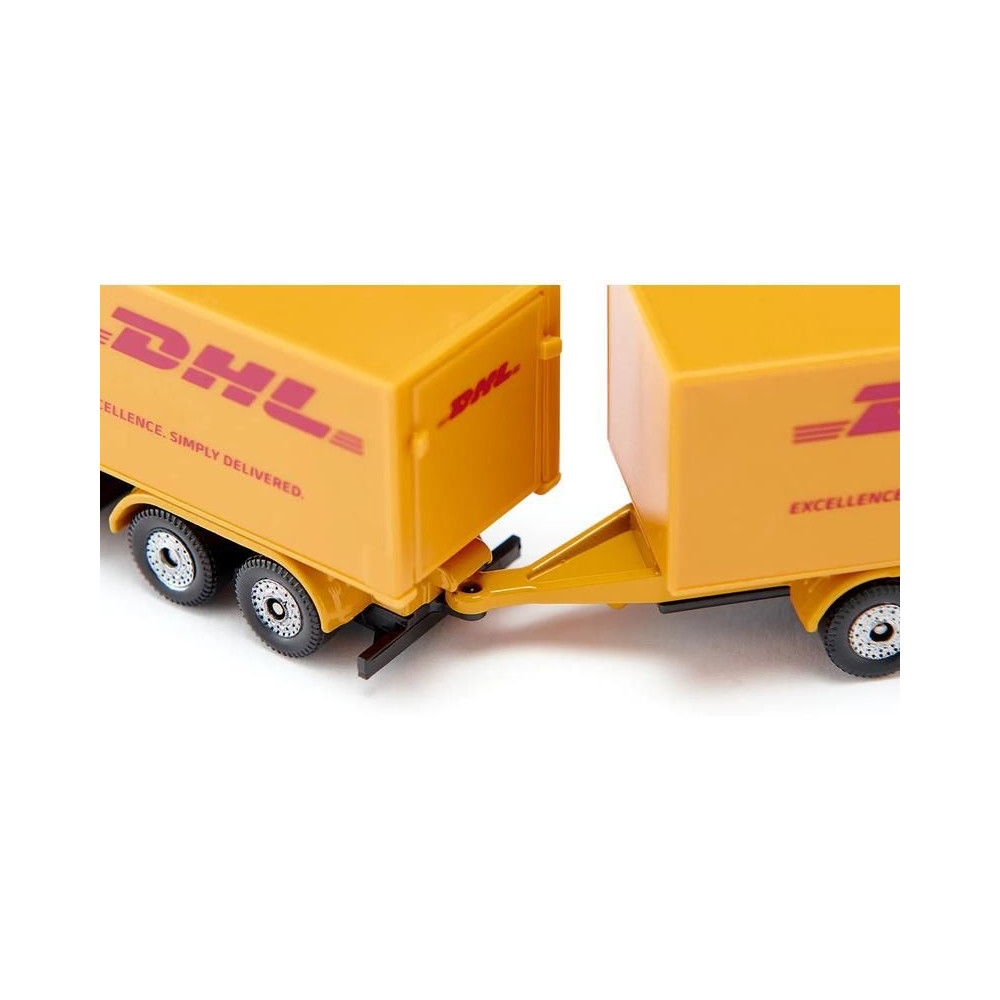 DHL teherautó fém modellje utánfutóval, hossza kb. 15 cm, méretarány 1:87. A modell átlátszó ablakokkal van felszerelve, a dobozos felépítmény és az utánfutó hátsó ajtajai nyithatók. A kéttengelyes utánfutó levehető. Játékra és gyűjtögetésre alkalmas. Minőségi fém- és műanyag kidolgozás. Blisztermesztőben csomagolva.