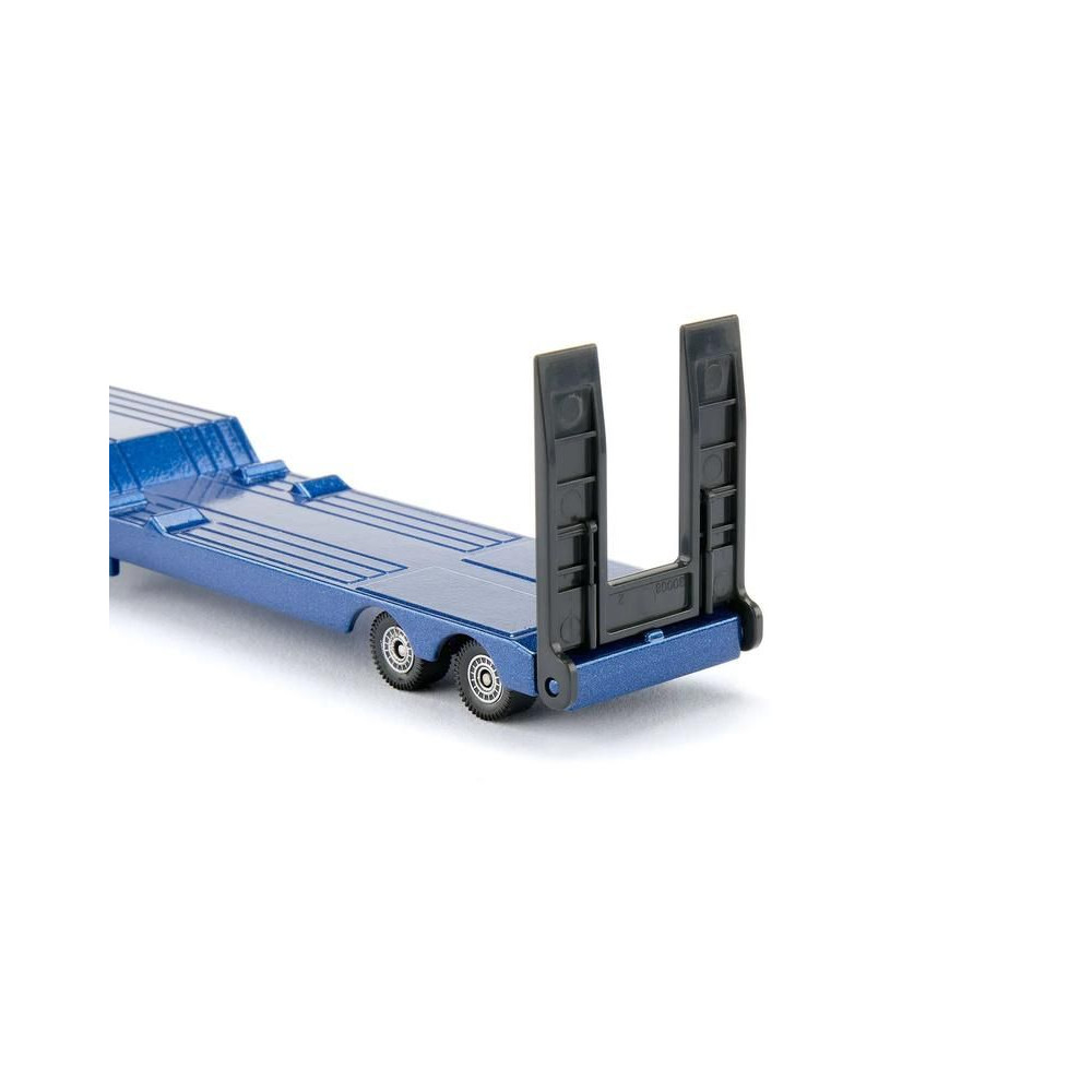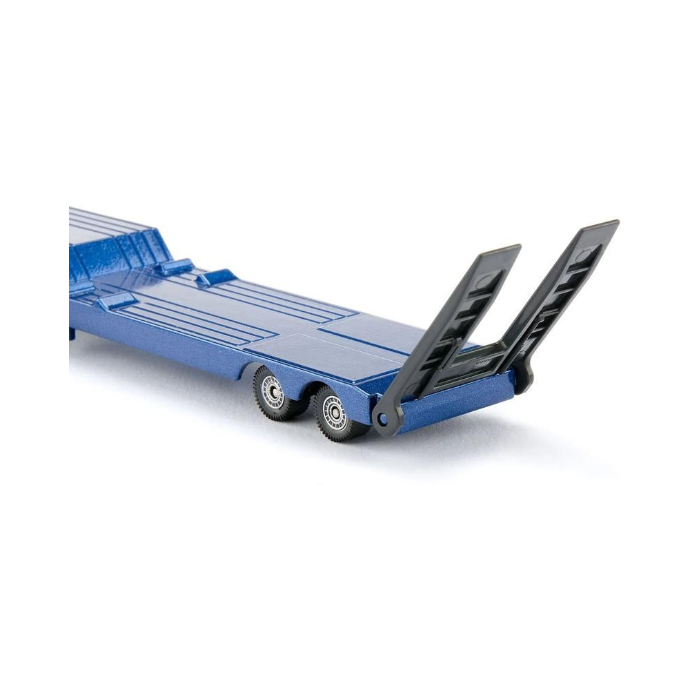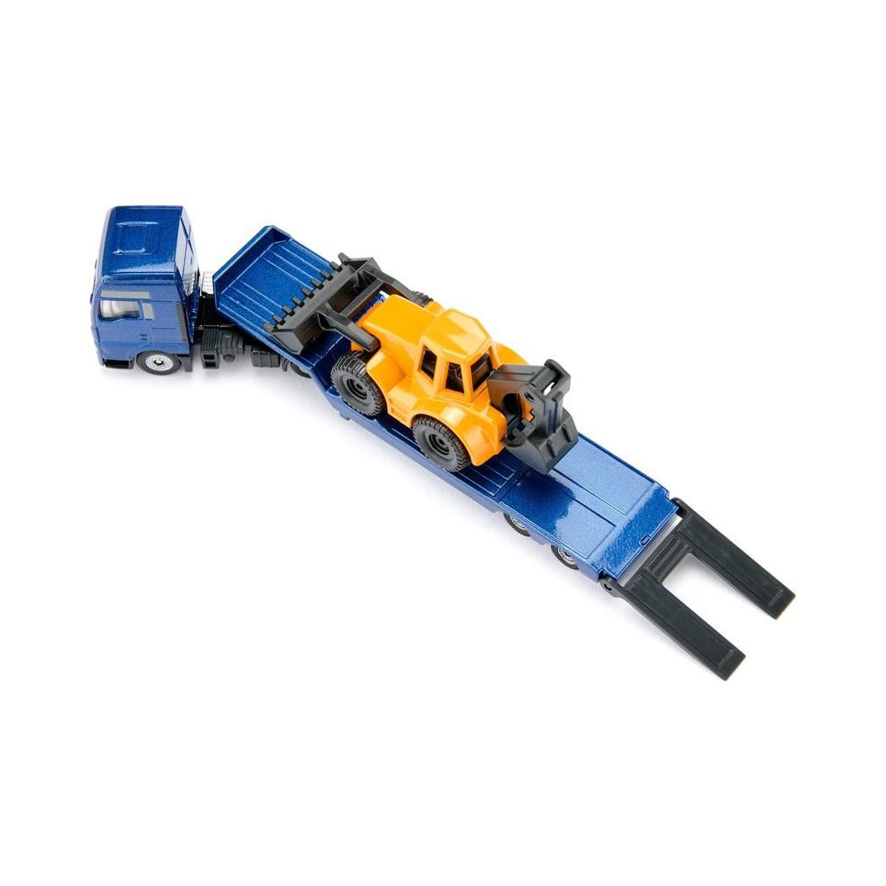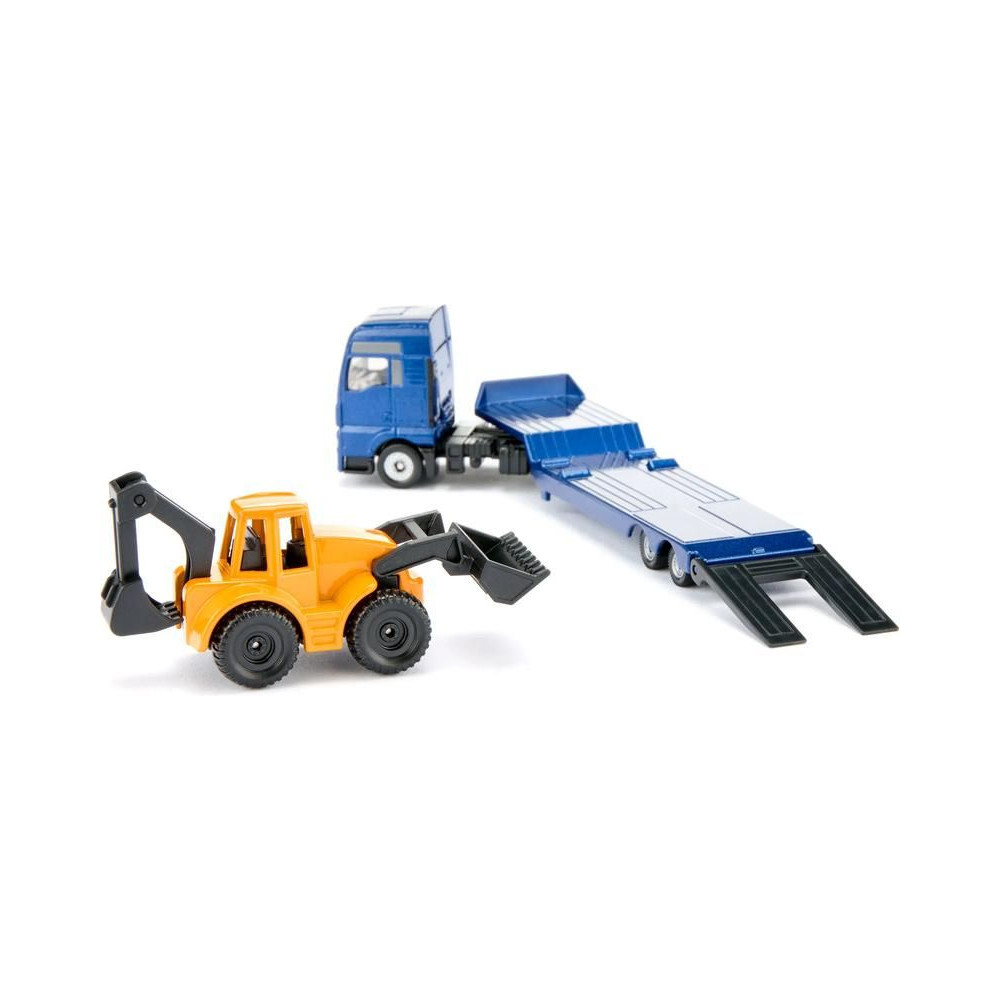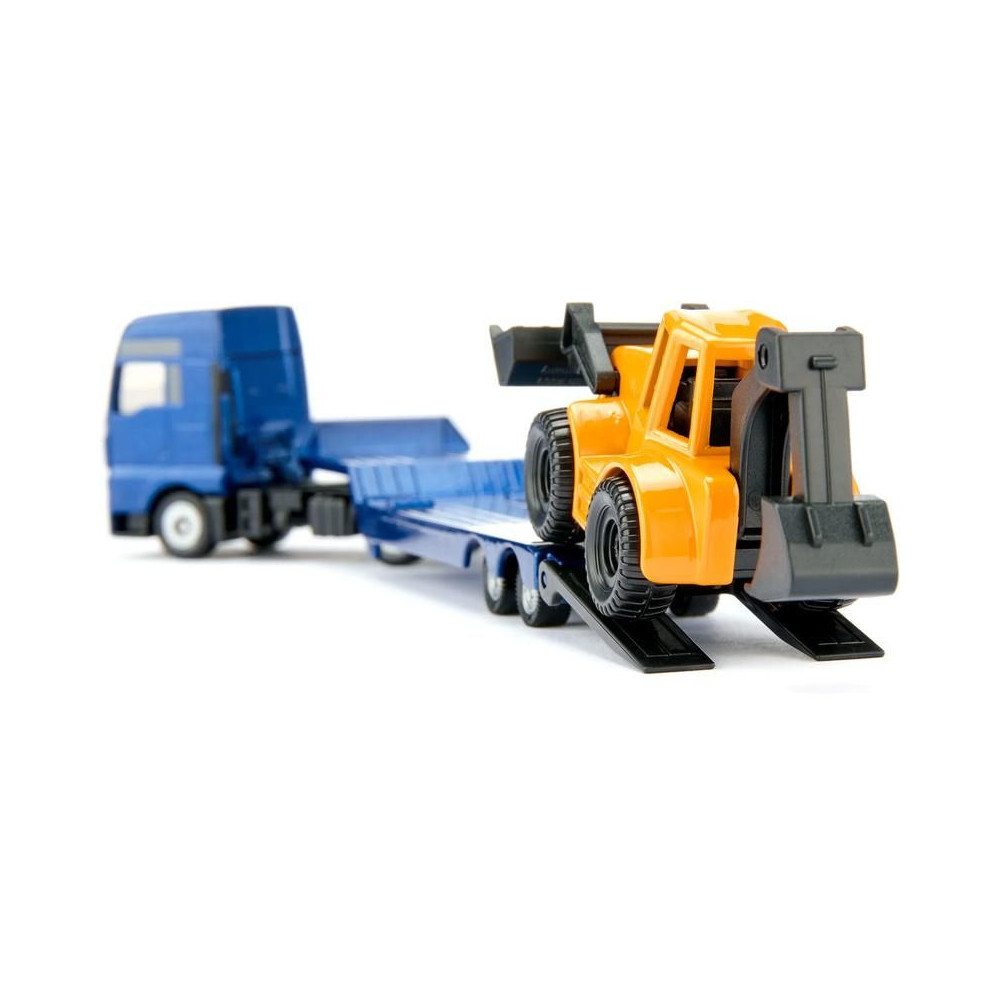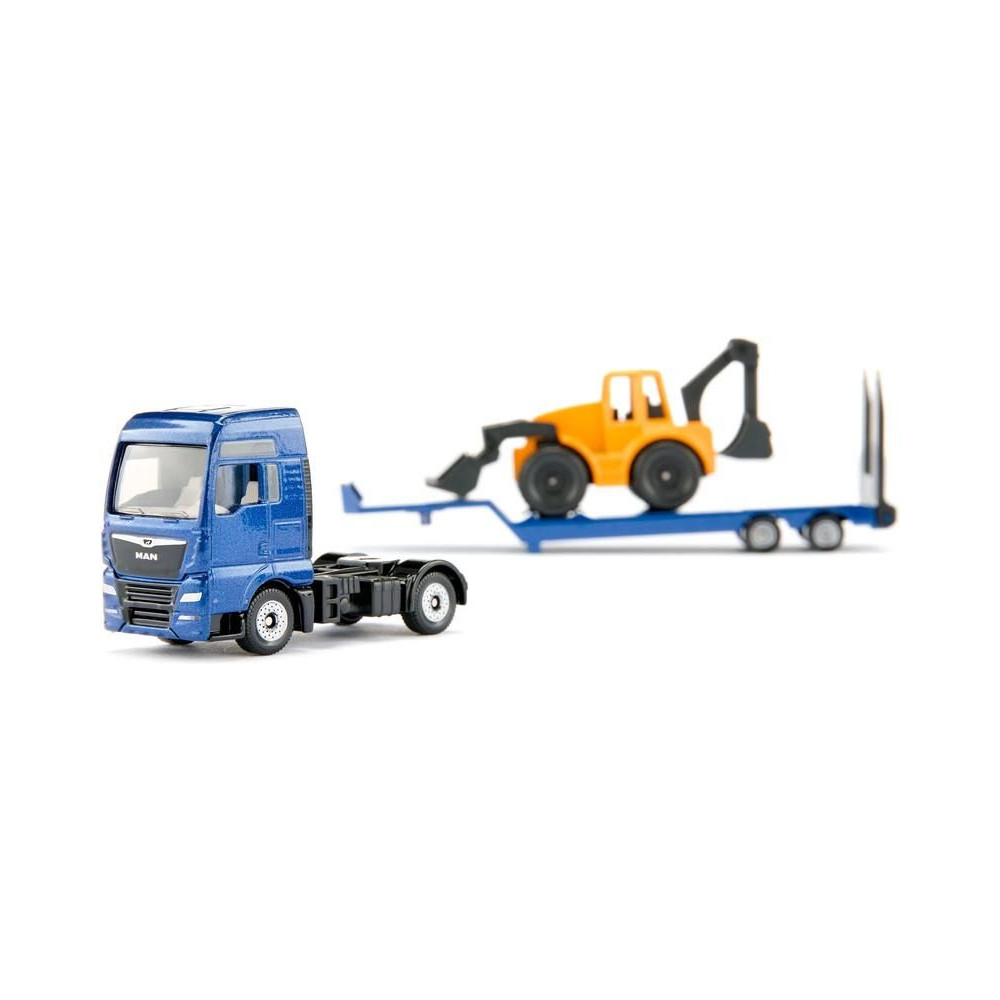 1:87 méretarányú SIKU márkájú MAN traktor fém modellje pótkocsival és kotrógéppel. Átlátszó ablakokkal és kifinomult belső térrel rendelkező traktor, beleértve egy levehető, kéttengelyes, összecsukható rámpás félpótkocsit. A kotrógép modell mozgatható homlokrakodóval és hátsó kotrógéppel rendelkezik. Játékra és gyűjtögetésre is alkalmas. Minőségi fém- és műanyag kidolgozás.