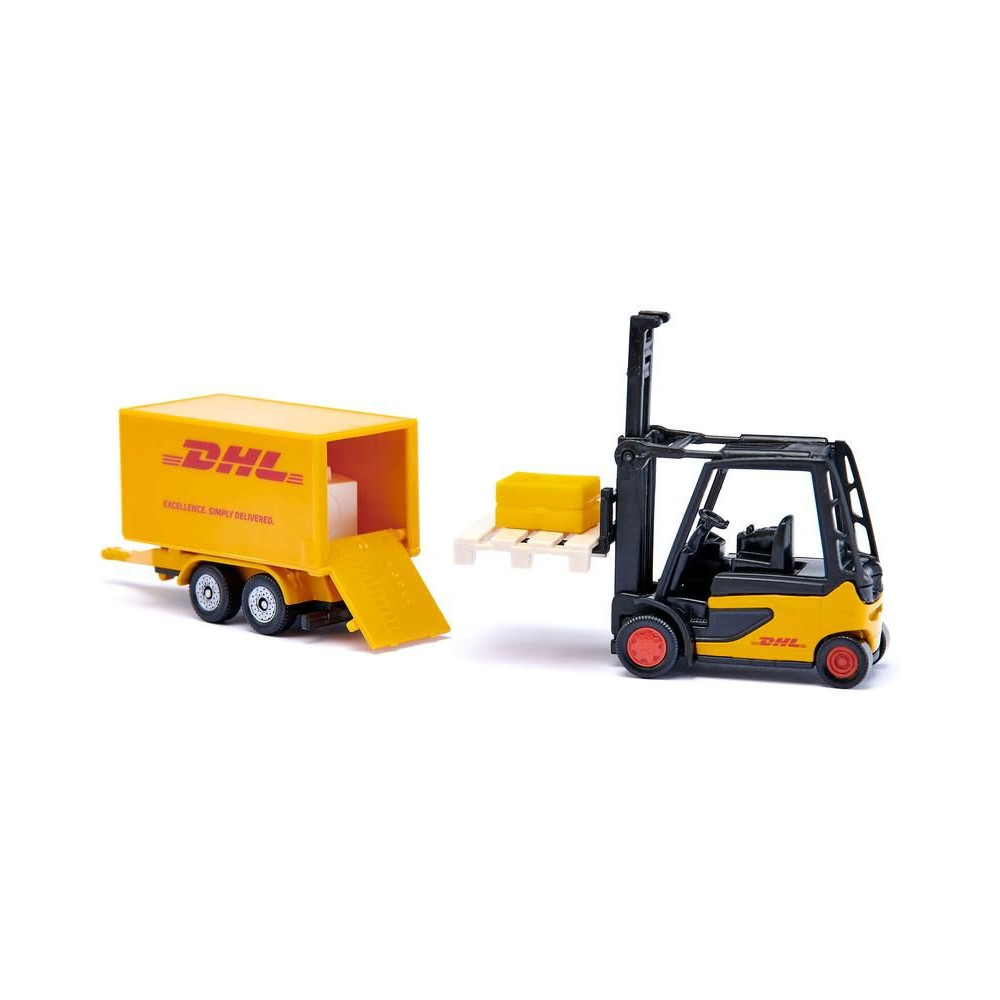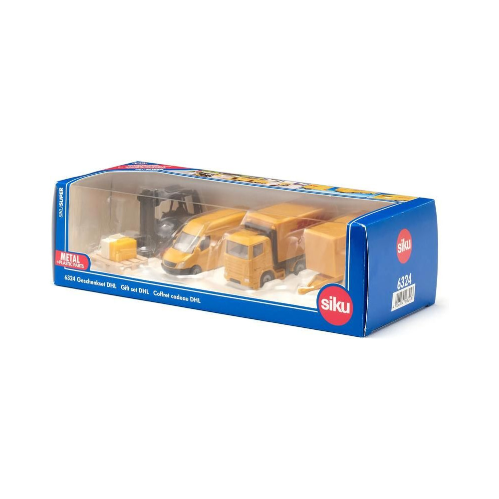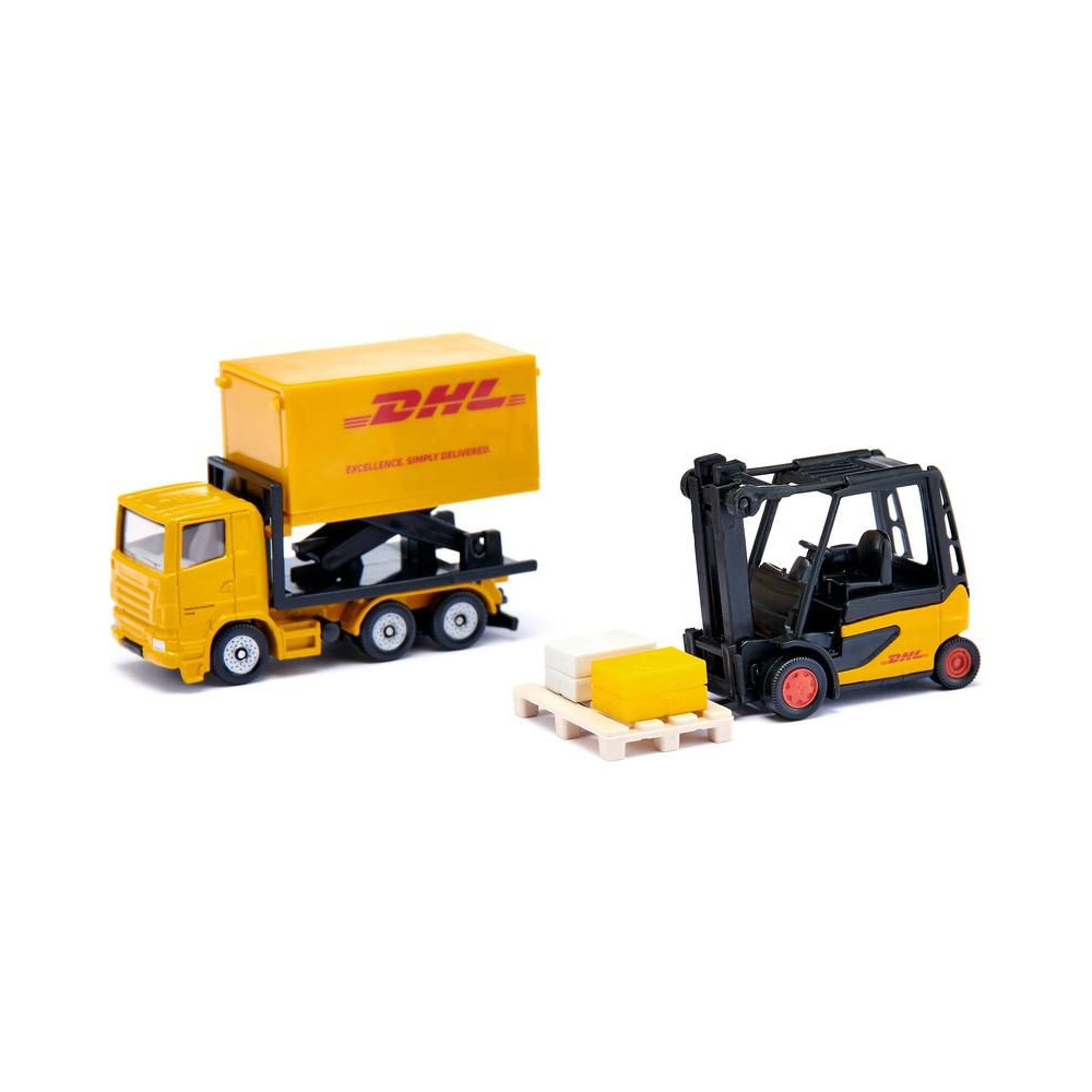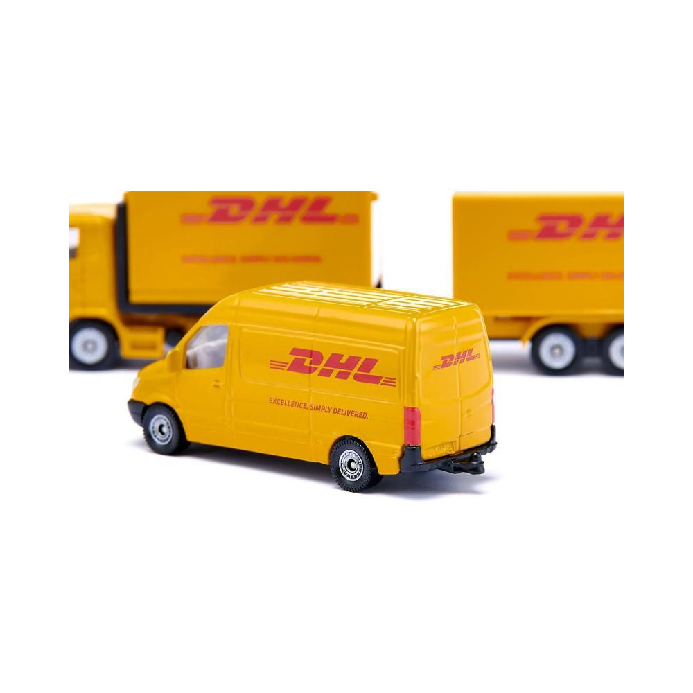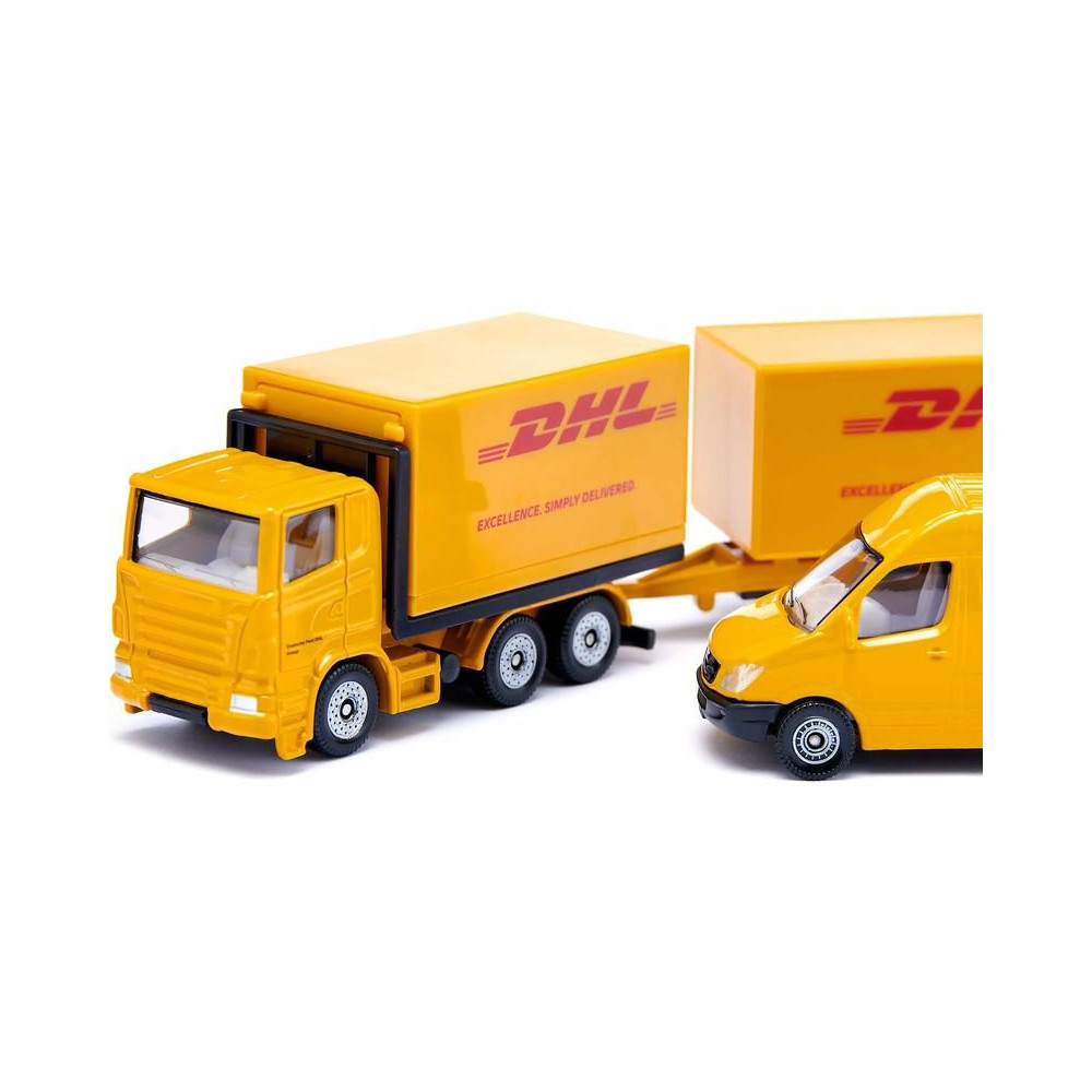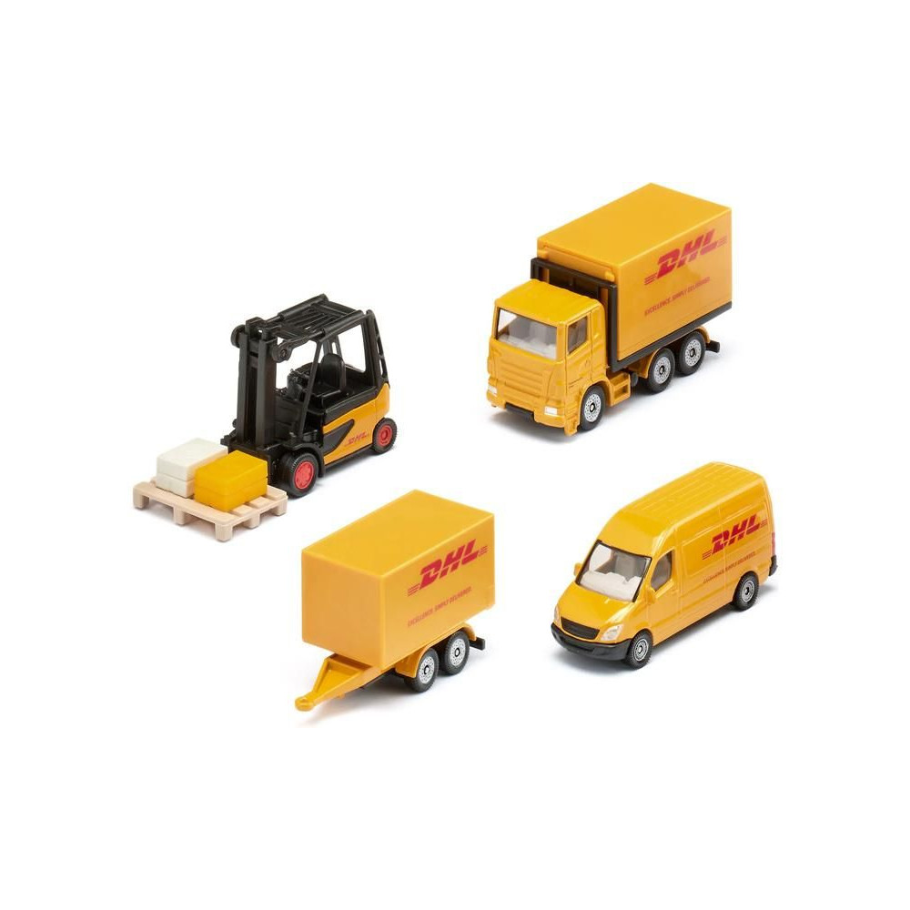 DHL fémmodell készlet a Siku márkától. A készlet tartalmaz egy ollós emelőszerkezetű felépítménnyel és levehető utánfutóval ellátott teherautót, egy furgont, egy mozgatható villákkal ellátott targoncát és egy bőröndökkel ellátott raklapot. A modellek átlátszó ablakokkal rendelkeznek. Játékra és gyűjtögetésre is alkalmas. Minőségi fém- és műanyagfeldolgozás.