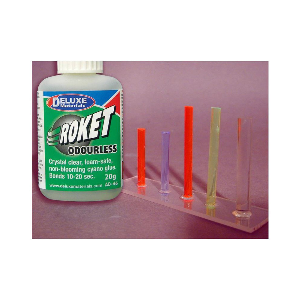 A Roket Odourless egy közepes konzisztenciájú cianokrilát ragasztó, amely szagmentesen ragaszt. 2-3 másodperccel később kötődik, mint a hagyományos cianokrilát ragasztók. A Roket Odourless nem támadja meg a habanyagokat (polisztirol, depron, polipropilén stb.), így kiválóan alkalmas ezen anyagok fakombinációkkal történő ragasztására.