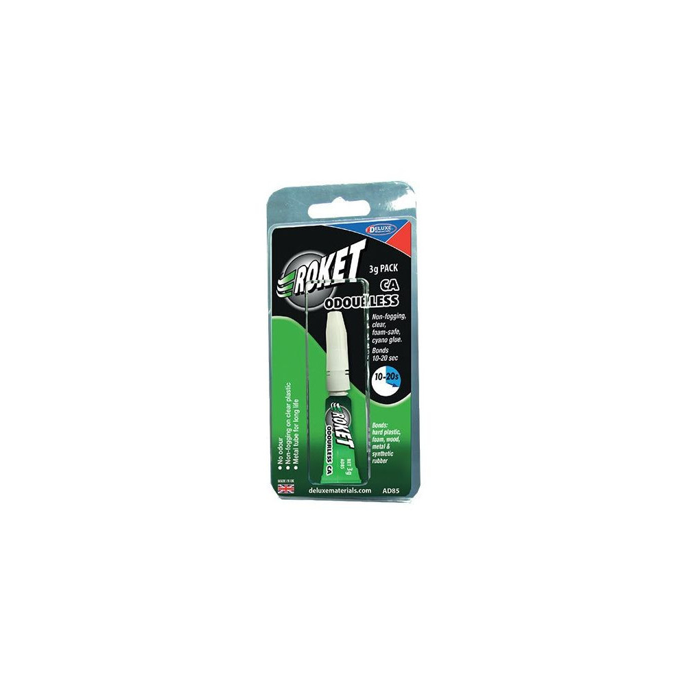 A Roket Odourless Gel egy sűrűbb állagú cianokrilát ragasztó, amely szag nélkül ragaszt. 2-3 másodperccel később kötődik, mint a hagyományos cianokrilát ragasztók. A Roket Odourless Gel nem támadja meg a habosított anyagokat (polisztirol, depron, polipropilén stb.), így kiválóan alkalmas ezen anyagok fa- vagy fémkombinációkkal történő ragasztására. A kötés kevesebb mint 20 másodperc alatt kész.