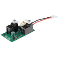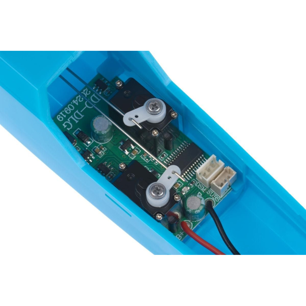 A modell vezérléséhez legalább egy négycsatornás távirányítóra lesz szükséged, amelyhez egy miniatűr vevőegység tartozik (1S LiPo akkumulátorról is működtethető), és soros S.BUS vagy DSM2 kimenettel rendelkezik. A vevőegységet egyszerűen a modell elektronikai paneljének megfelelő bemenetéhez kell csatlakoztatni - a dekóder csatornakiosztása fix: a magassági kormány a 2-es, a kormánylapát a 4-es csatornán van.