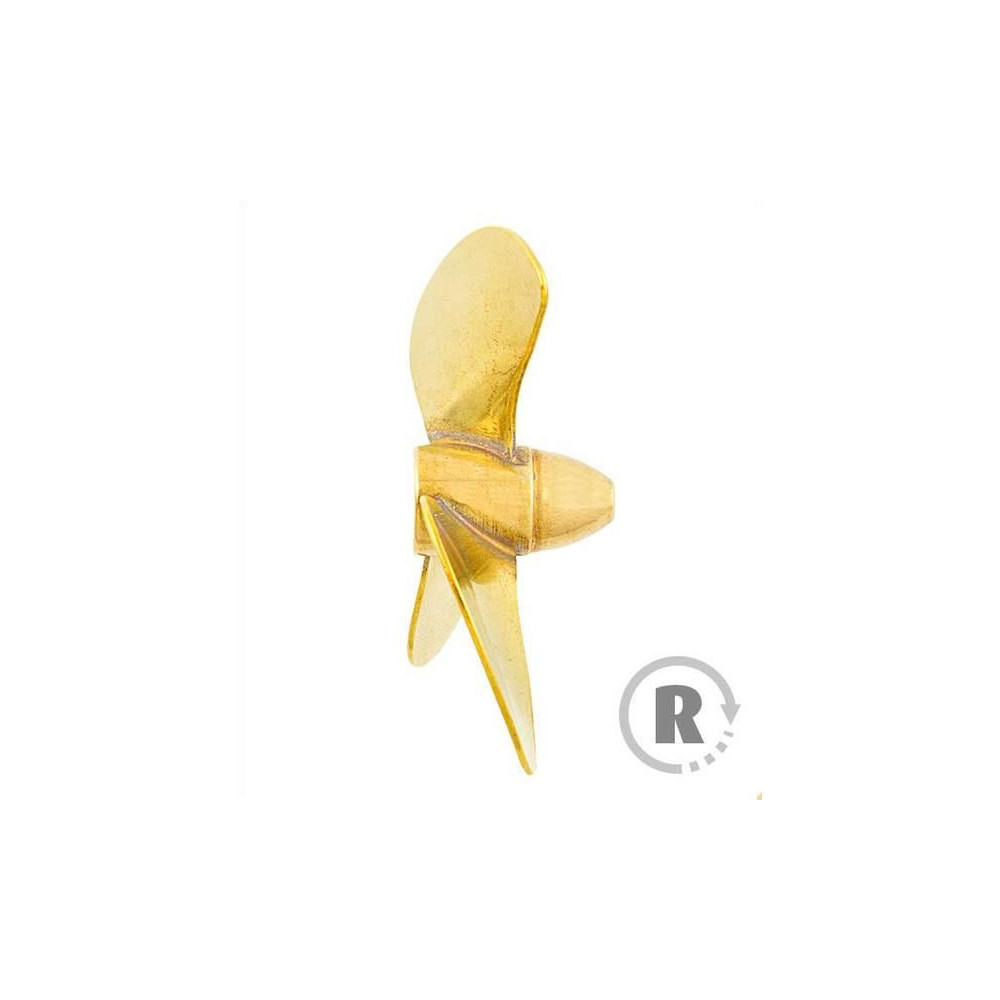 Raboesch hajócsavar 160-as osztályú 3-lapátos, átmérője 20mm, jobbos forgásirányú, tengelyrögzítés M2-es menettel, anyaga sárgaréz, ezüsttel forrasztott.