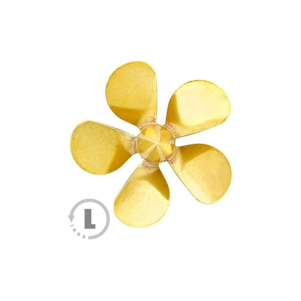 Raboesch hajócsavar 181-es osztályú 5 lapátos, 75mm átmérőjű, balos forgásirányú, tengelyfelvétel M5-ös menettel, anyaga sárgaréz, ezüsttel forrasztott.