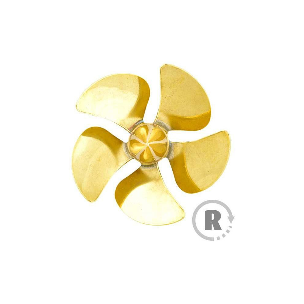 Raboesch hajócsavar 183-as osztályú 5 lapátos, átmérője 55mm, jobbos forgásirányú, tengelyrögzítés M5-ös menettel, anyaga sárgaréz, ezüsttel forrasztott.