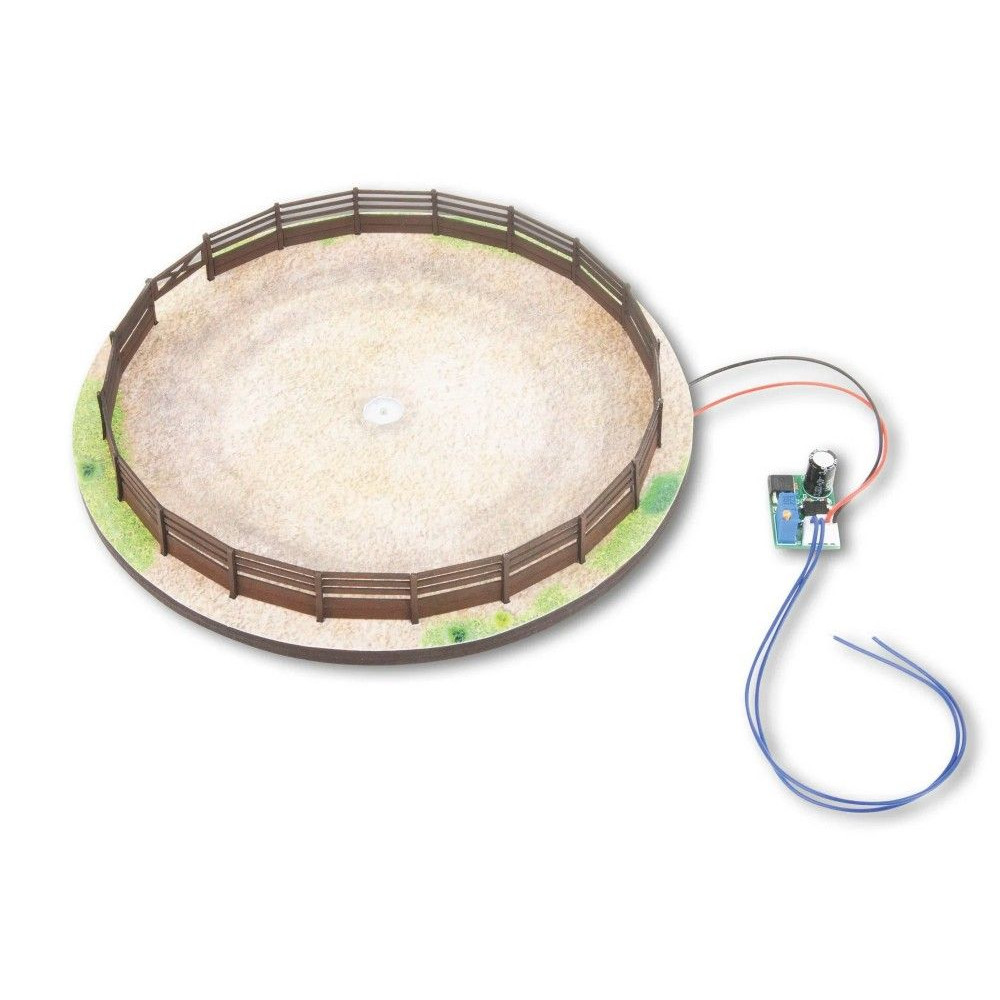 A NOCH 66717 prémium H0 méretarányú építőkészlet forradalmi mozgást visz a modelltájképedbe. Tartalmaz egy lovardát, amelyben egy ló mozog a mágneses, földalatti meghajtásnak köszönhetően. Az élményt egy integrált hangmodul teszi teljessé nyerítéssel és paták domborításával. A lézervágott készlet mindent tartalmaz, amire szükséged van, beleértve az elektronikát és a ragasztót is.