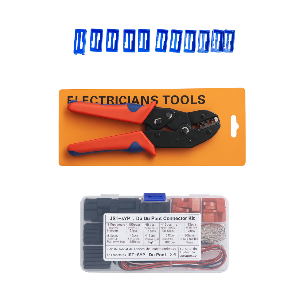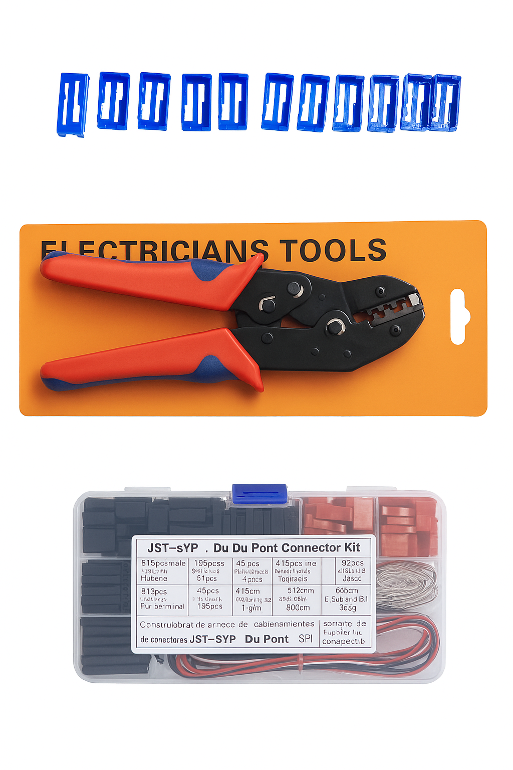 Komplett készlet RC modellek szervokábeleinek gyártásához és javításához. Mindent tartalmaz, ami a gyors és professzionális összeszereléshez szükséges - a kiváló minőségű 22 AWG vezetékektől a dugaszos és anya csatlakozókon át a krimpelőfogókig.