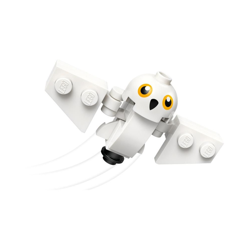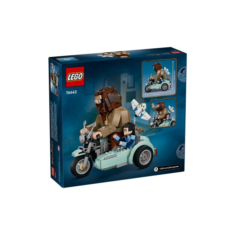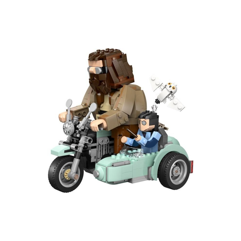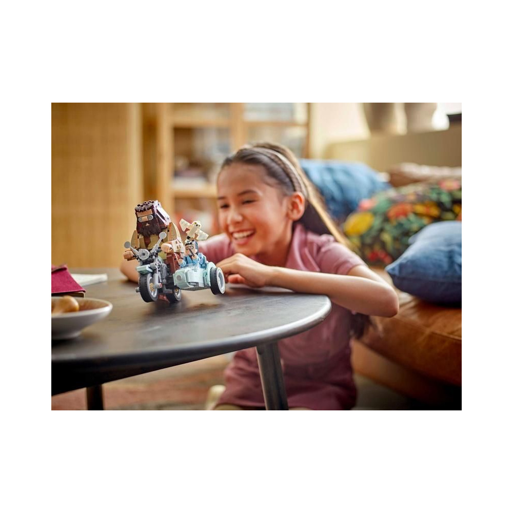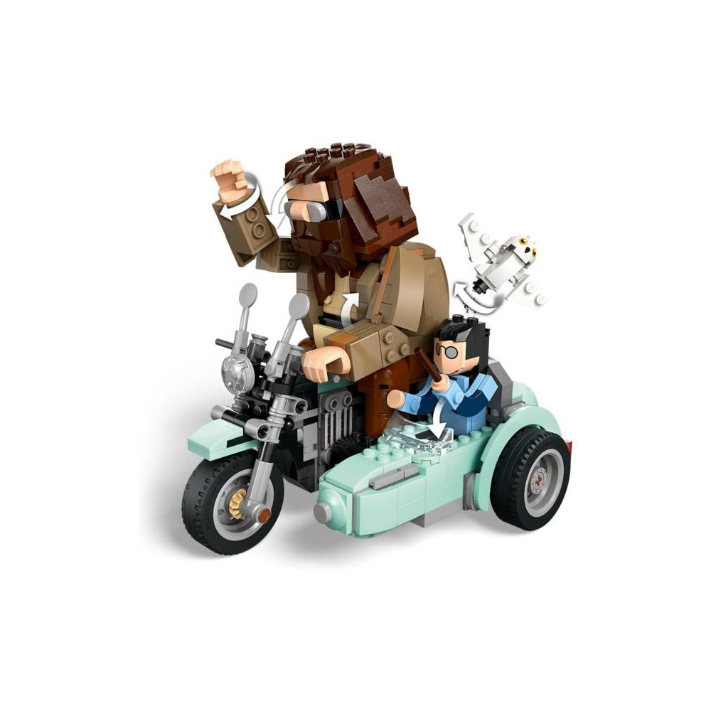 - 3 LEGO® Harry Potter™ kockából készült figura – A modell tartalmazza Harry Potter, Hedwig és Rubeus Hagrid beépített, mozgatható figuráit, akik Hagrid repülő, oldalkocsis motorján utaznak.