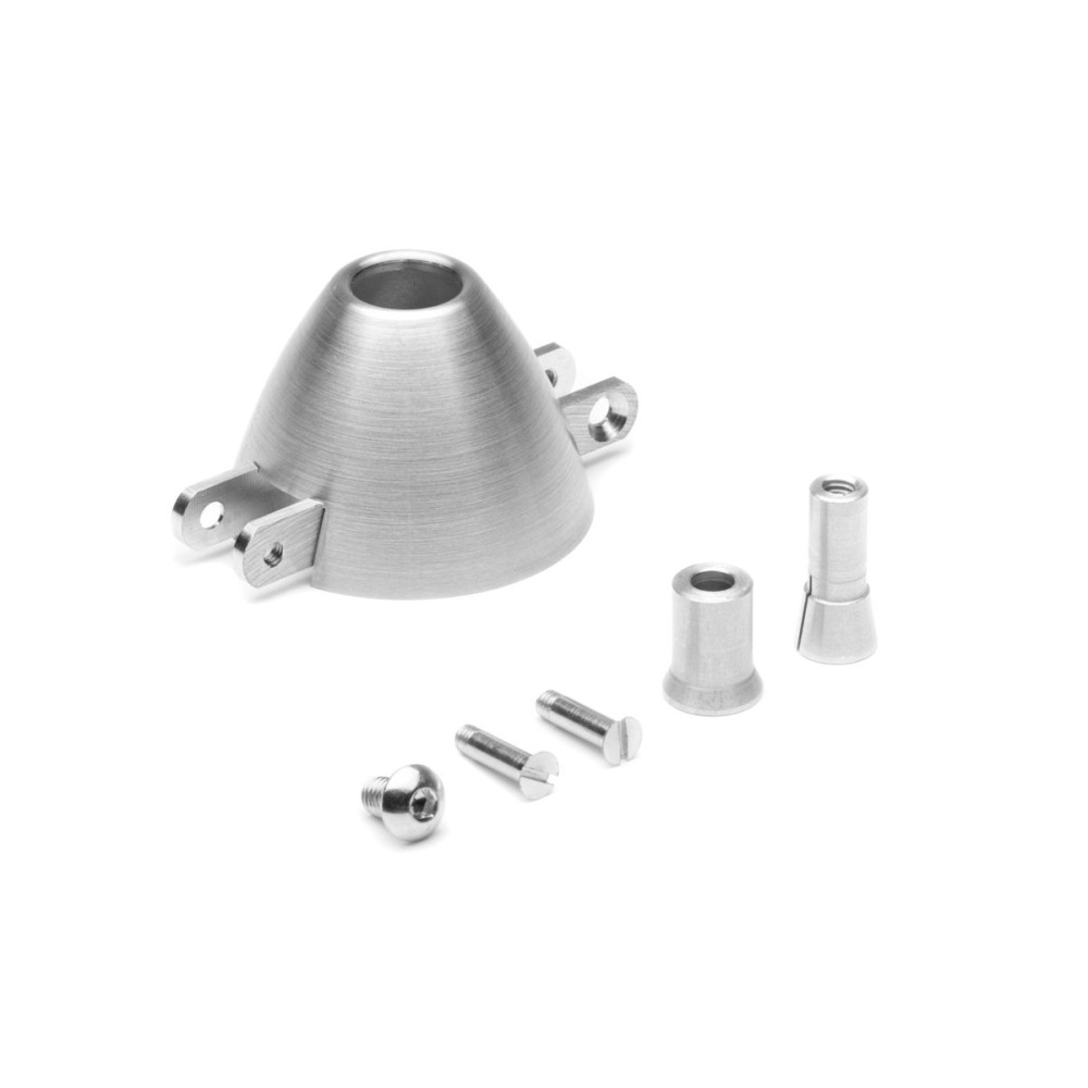Precíziós duralumínium TURBO kúp 38 mm átmérőjű összecsukható légcsavarhoz 3,17 mm-es fogóval, 3 mm-es csapokkal 8 mm-es gyökérvastagságú légcsavarlapokhoz. Csehországban készült.