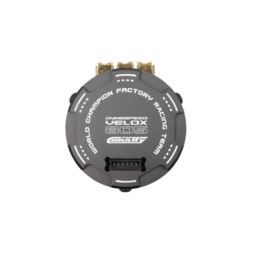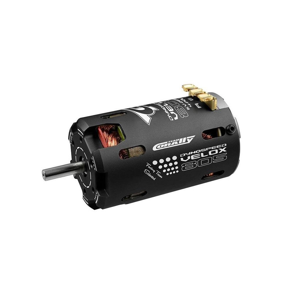 TEAM CORALLY DYNOSPEED VELOX 805 kefe nélküli motor 1/8 On Road RC modellekhez. Működési feszültség: 2S-4S, test hossza: 67,8mm, átmérő: 40,8-42,8mm, súly: 340g, fordulatszám 1Voltonként: 1.750 rpm, tengely 5,00mm.