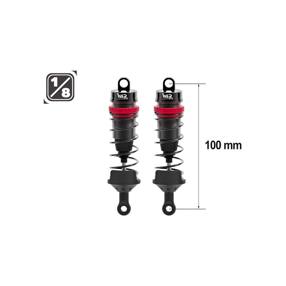Teljesen alumínium olajütközők 1/8 és hasonló modellekhez, a csapok közötti teljes hossz 100 mm, a dugattyú átmérője 16 mm. A készlet tartalmazza: három pár rugót: lágy, közepes és kemény; felső és alsó rögzítőanyag.