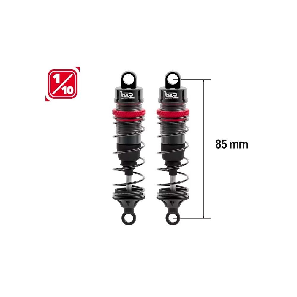 Teljesen alumínium olajcsillapítók 1/10 és hasonló modellekhez, a csapok közötti teljes hossz 85 mm, a dugattyú átmérője 13 mm. A készlet a következőket tartalmazza: három pár rugó: lágy, közepes és kemény; felső és alsó rögzítőanyag.