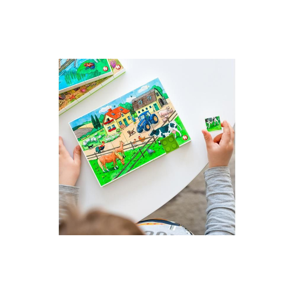 Állítsd össze az Élet a farmon képet a Hubelino blokkok segítségével, a csomag tartalmaz egy alátétet, amelyre a blokkok fel vannak erősítve. A kép 35 kockából áll össze. Elősegíti a gyermekek logikus gondolkodásának és szenzomotoros képességeinek fejlődését. Alkalmas 4 éves kortól.