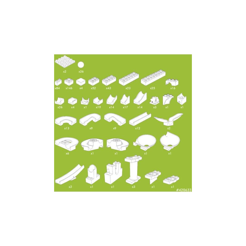 Az 585 darabos készlet a Hubelino történetének legnagyobb készlete. A sok építőkocka, pályaelem, alaplemez, golyó és speciális alkatrész mellett a készlet átfogó képes útmutatót is tartalmaz három gigantikusan izgalmas pályával. A pálya olyan speciális elemeket tartalmaz, amelyek még szórakoztatóbbá teszik a pályát, mint például a csavart, bölcsőt, kapcsolókat, liftet stb.