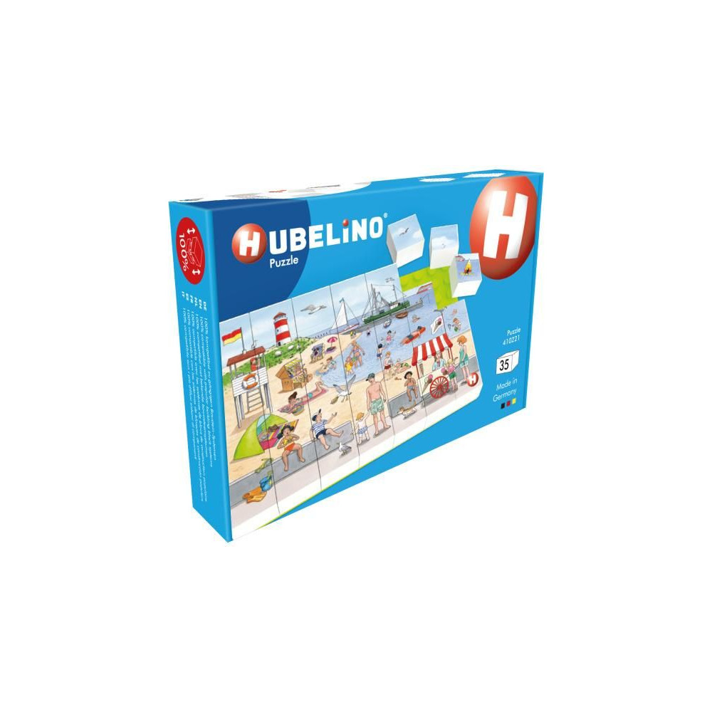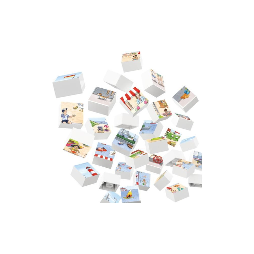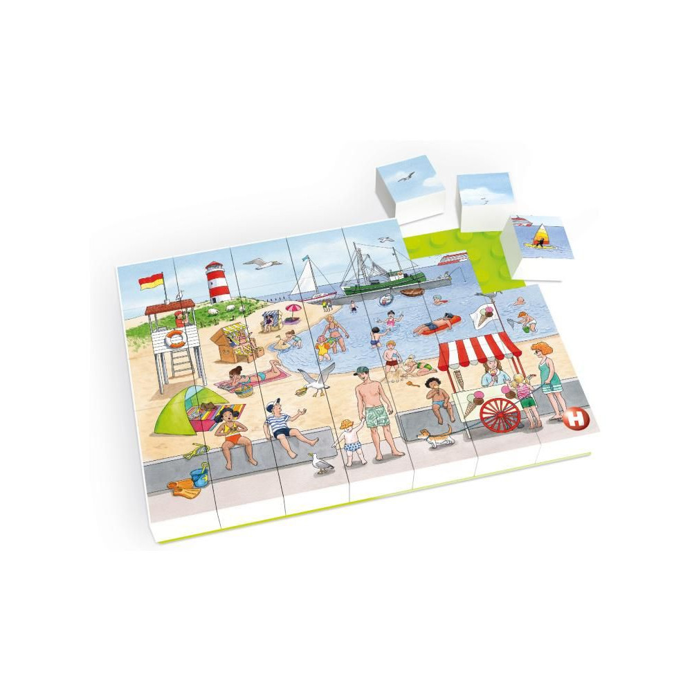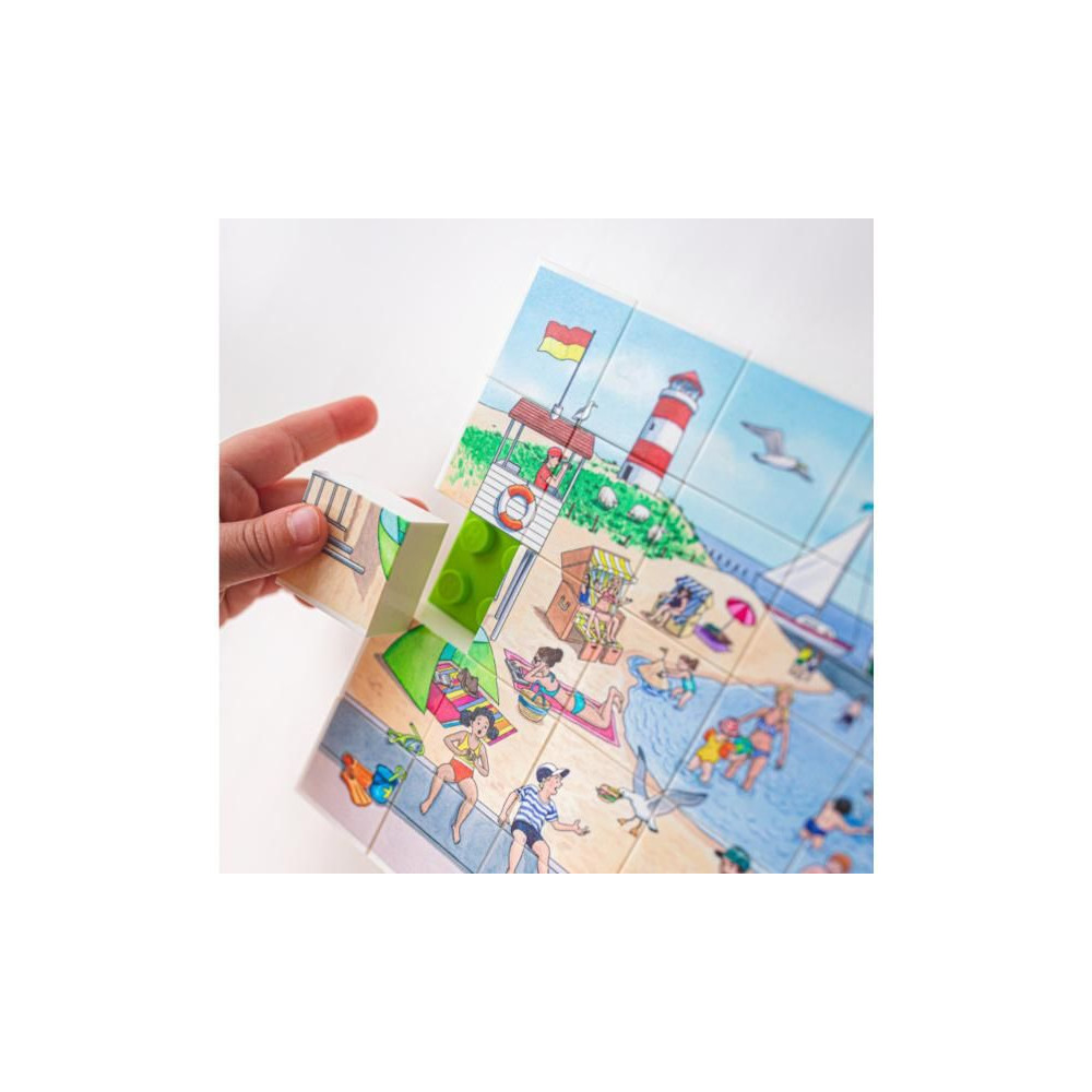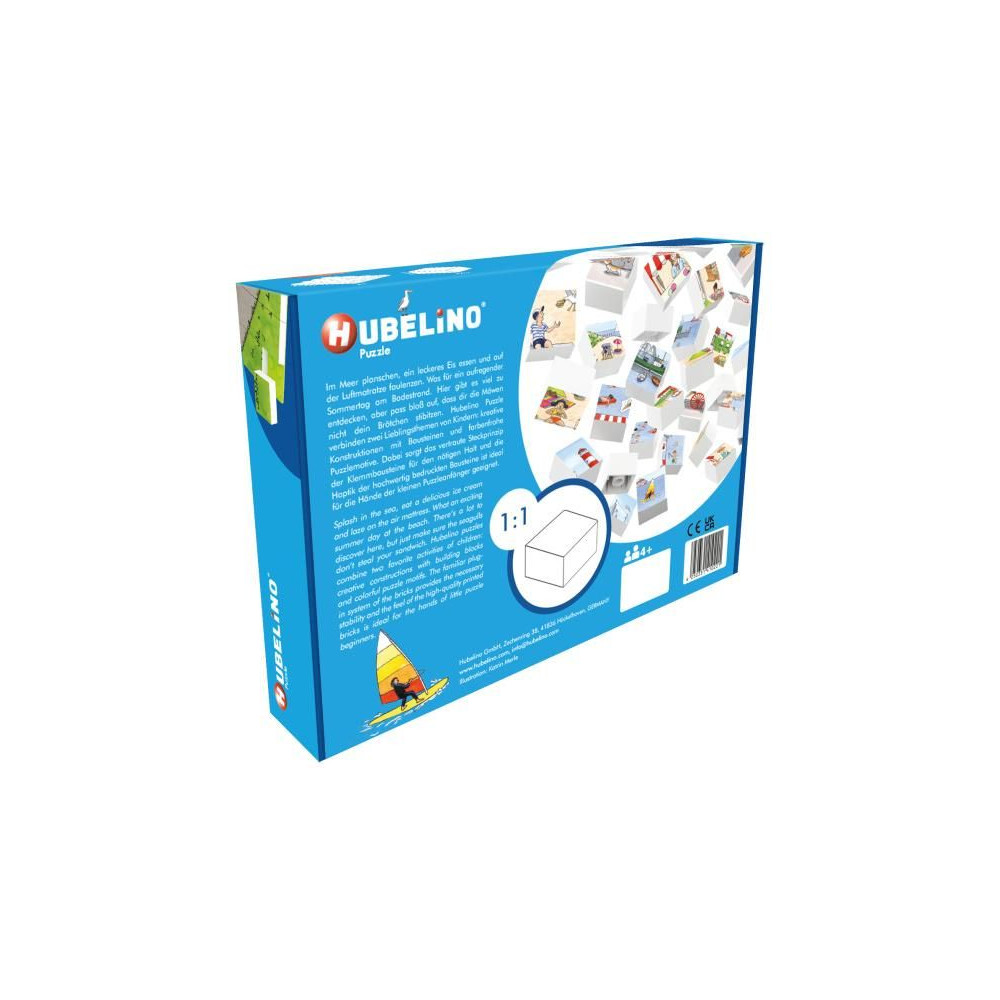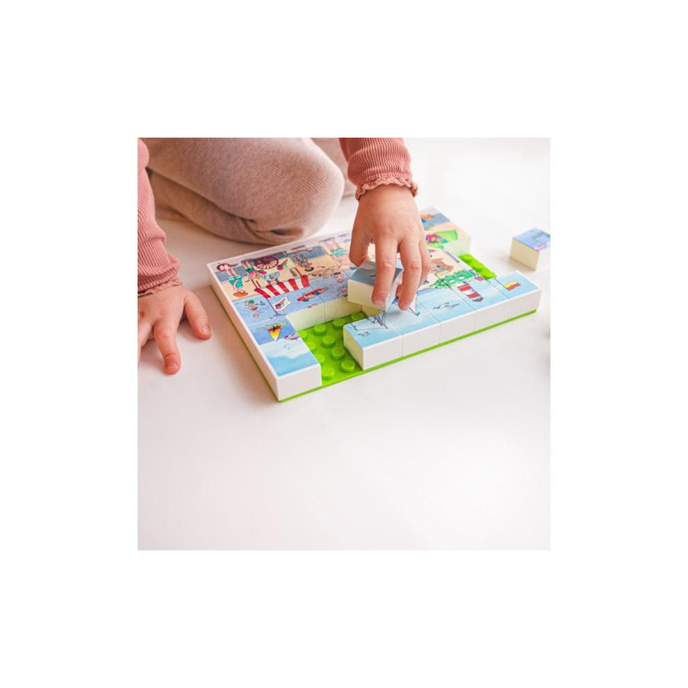 Állítsa össze a képet Holiday on the beach (Nyaralás a tengerparton) a Hubelino kockákból, a csomag tartalmaz egy szőnyeget, amelyre a kockák fel vannak erősítve. A kép 35 kockából áll össze. Elősegíti a gyermekek logikus gondolkodásának és szenzomotoros képességeinek fejlődését. Alkalmas 4 éves kortól.