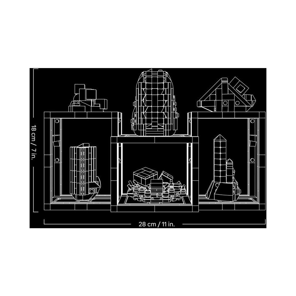 - Méretek – Ez a gyűjthető LEGO® modell 880 darabból áll, és több mint 18 cm magas, 28 cm széles és 7 cm mély, ha az összes polcot egymás mellé helyezed.