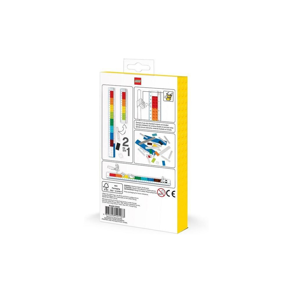 LEGO vonalzó készlet 30 cm hosszúsággal, LEGO minifigurás csomagban. Kövesd az utasításokat, hogy a vonalzót könnyedén és szórakoztató módon összeszerelhesd az igényeidnek megfelelően. A csomag színes LEGO betéteket tartalmaz, amelyekkel ceruzát, ceruzahegyezőt vagy akár kedvenc LEGO minifigurádat is rögzítheted a vonalzóhoz. A vonalzó két skálával rendelkezik - cm-ben és hüvelykben.